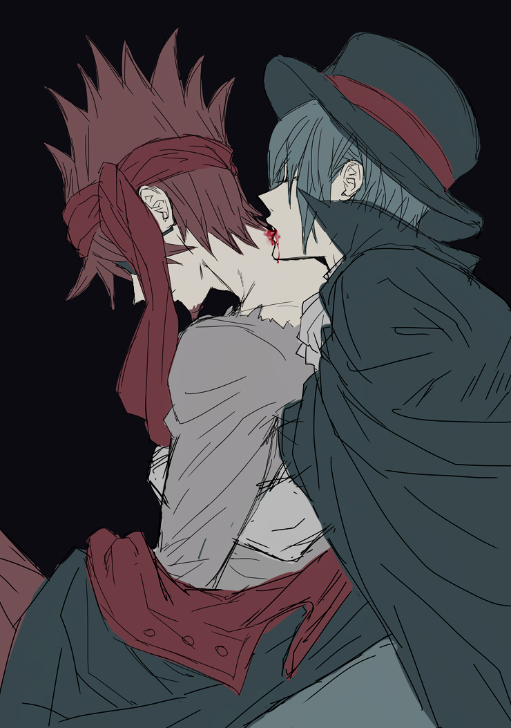2boys biting black_background black_cape black_headwear blood brown_hair cape danganronpa_(series) danganronpa_v3:_killing_harmony facial_hair from_side goatee grey_shirt hairband hug hug_from_behind male_focus momota_kaito multiple_boys neck_biting off_shoulder ore_sensei red_hairband saihara_shuichi shirt short_hair simple_background sketch spiked_hair vampire