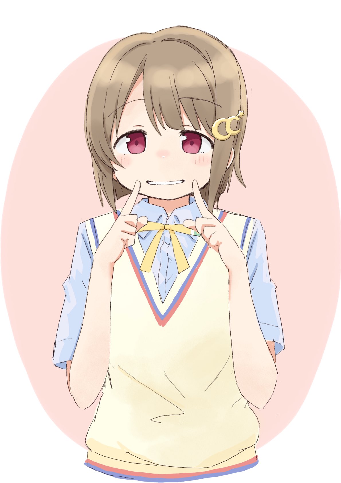 1girl blush bow bowtie check_commentary commentary_request crescent crescent_hair_ornament dot_nose fingers_to_cheek hair_ornament hands_up highres index_fingers_raised light_brown_hair looking_at_viewer love_live! love_live!_nijigasaki_high_school_idol_club nakasu_kasumi red_eyes shirt short_hair short_sleeves sidelocks smile solo tonpon upper_body vest white_background white_shirt yellow_bow yellow_bowtie yellow_vest