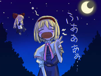 alice_margatroid bad_link blonde_hair blue_dress crescent dress fang headband lowres moon night shanghai_doll touhou tree verynezumi yawning