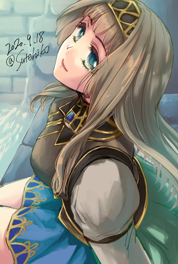 1girl alicia_(valkyrie_profile_2) blonde_hair dress gold_trim green_eyes hairband long_hair looking_at_viewer straight_hair sutehiko valkyrie_profile_(series) valkyrie_profile_2:_silmeria