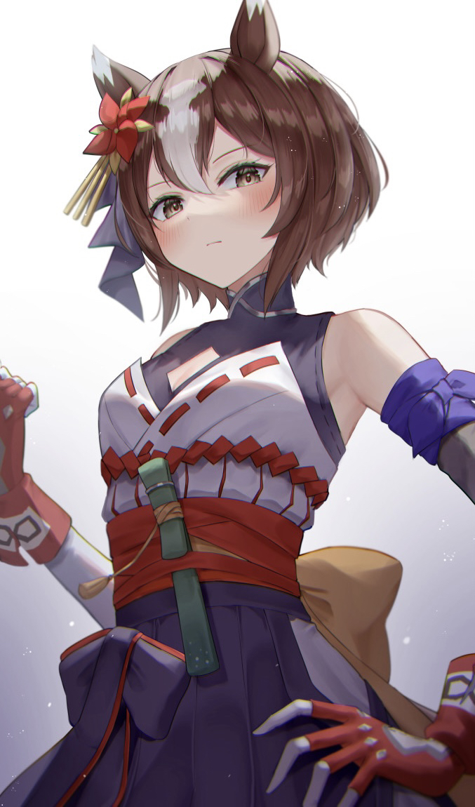 1girl animal_ears armpits blue_hakama blue_skirt blush breasts brown_hair cleavage_cutout closed_mouth clothing_cutout flower gloves hair_between_eyes hair_flower hair_ornament hakama hakama_short_skirt hakama_skirt hip_vent horse_ears horse_girl japanese_clothes kimono looking_at_viewer multicolored_hair pinwheel_hair_ornament red_gloves short_hair skirt sleeveless sleeveless_kimono small_breasts solo streaked_hair umamusume white_hair yaeno_muteki_(umamusume) yoimoriyoru
