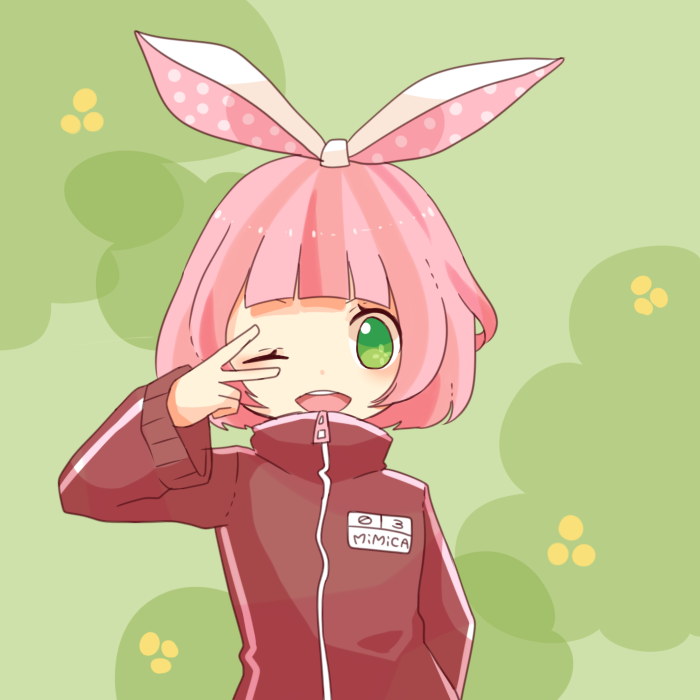 1girl :d blunt_bangs green_eyes hair_ribbon high_collar jacket long_sleeves name_tag one_eye_closed open_mouth original pink_hair polka_dot polka_dot_ribbon pomx ribbon short_hair smile solo teeth track_jacket upper_teeth_only v v_over_eye zipper_pull_tab