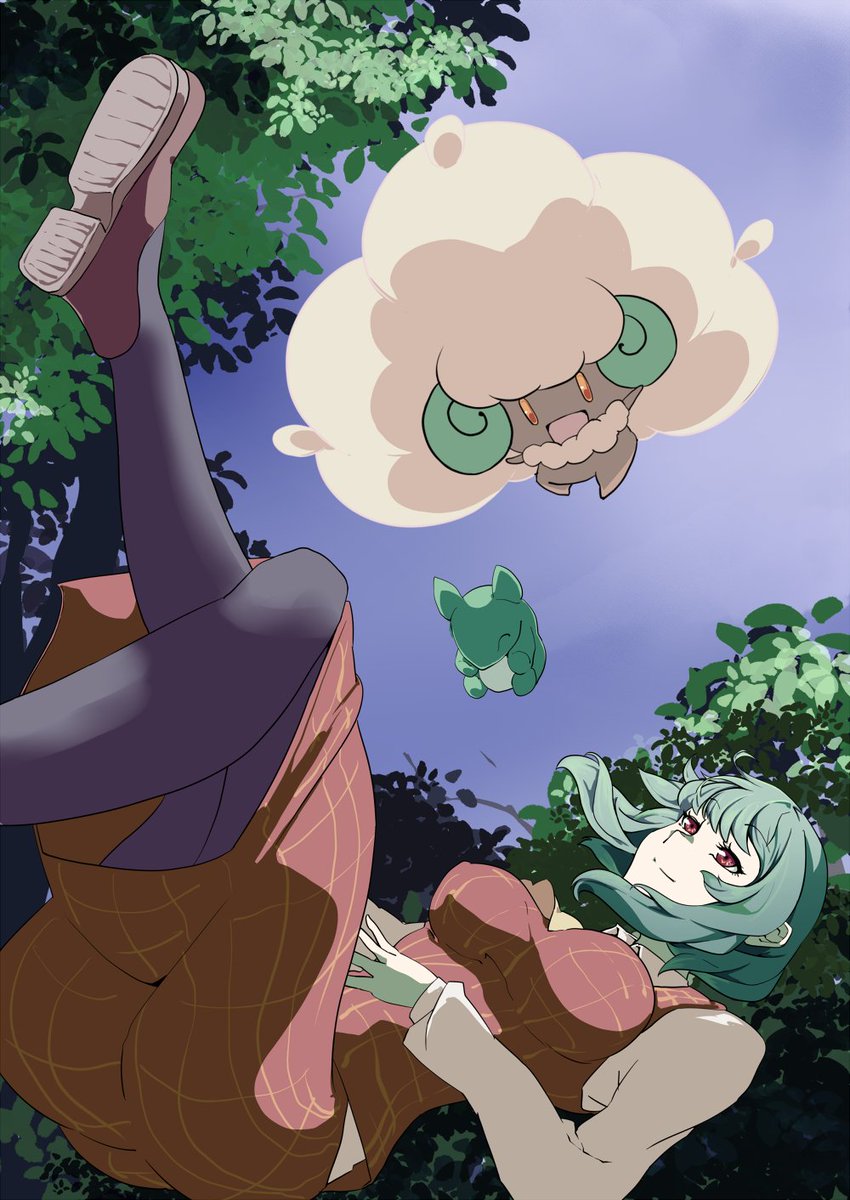 1girl blue_sky breasts brown_footwear closed_mouth gen_5_pokemon green_hair highres kazami_yuuka nintendo outdoors plaid_clothes plaid_skirt plaid_vest pokemon pokemon_(creature) potato_pot red_eyes red_skirt red_vest shirt short_hair skirt sky smile substitute_(pokemon) touhou tree vest whimsicott white_shirt