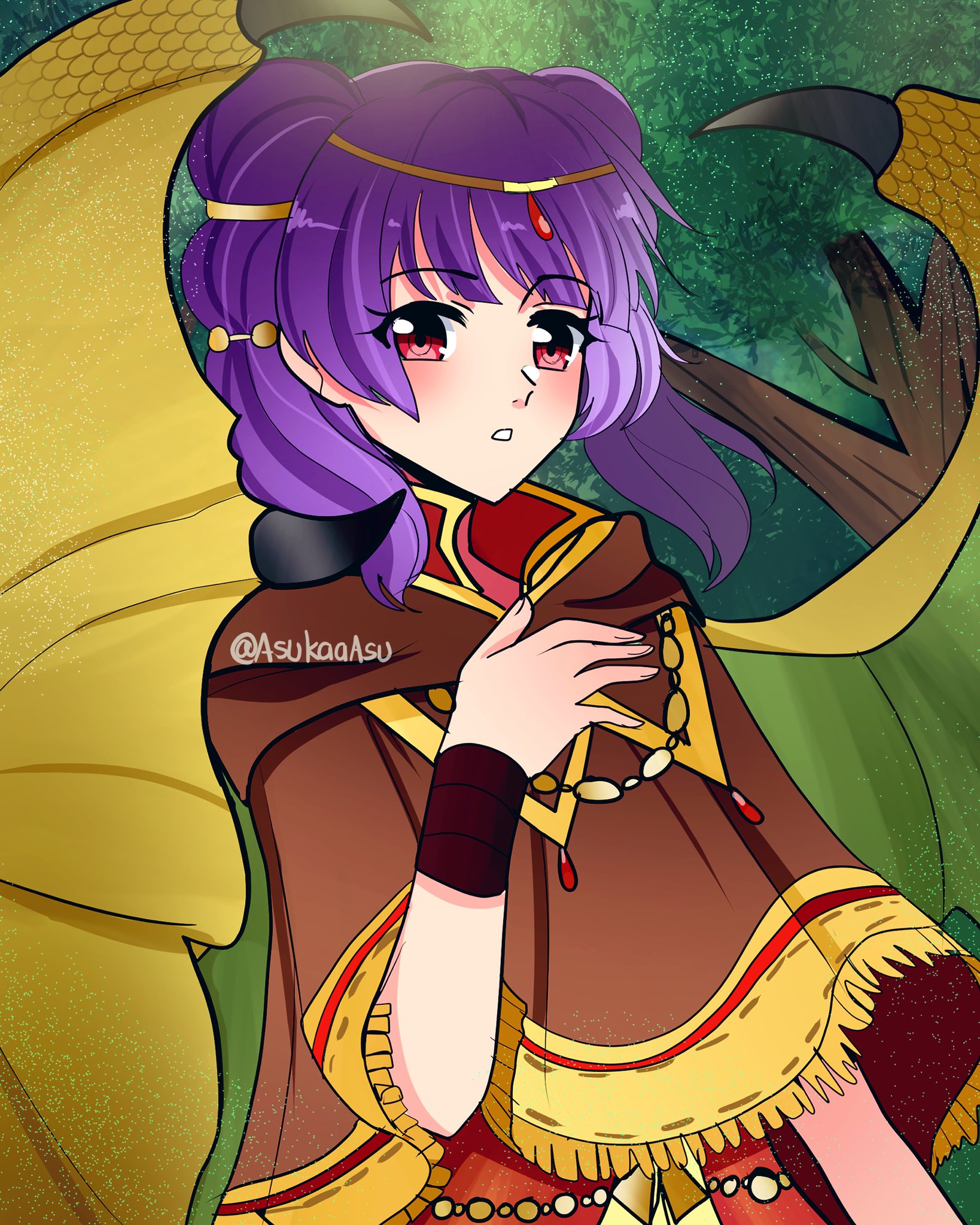 1girl asukaaasuu bead_necklace beads blunt_bangs blush bracelet brown_capelet brown_coat capelet circlet coat dragon_girl dragon_wings eyelashes female_focus fire_emblem fire_emblem:_the_sacred_stones fire_emblem_heroes foliage fringe_trim gold_trim green_wings hair_ornament hair_tie hand_on_own_chest highres hood jewelry long_hair looking_at_viewer multi-tied_hair multicolored_coat myrrh_(fire_emblem) necklace nintendo official_alternate_costume pale_skin parted_lips purple_hair red_coat red_eyes solo tree twintails upper_body wings wristband yellow_wings