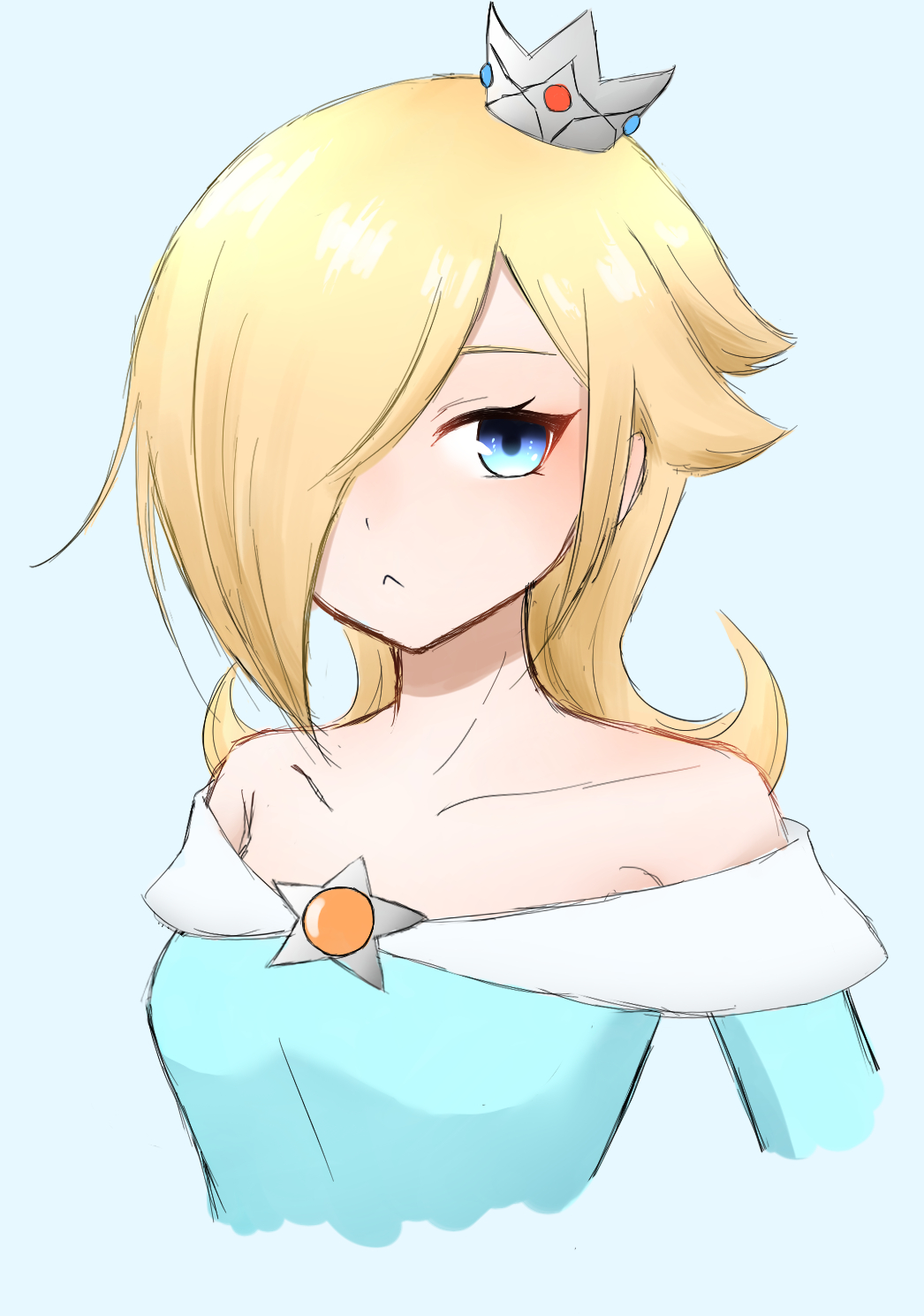 1girl aqua_eyes bare_shoulders blonde_hair blue_background blue_dress blush brooch closed_mouth crown dress earrings hair_ornament highres jewelry long_hair looking_at_viewer mario_(series) nintendo off_shoulder rosalina solo super_mario_galaxy tomatomiya upper_body