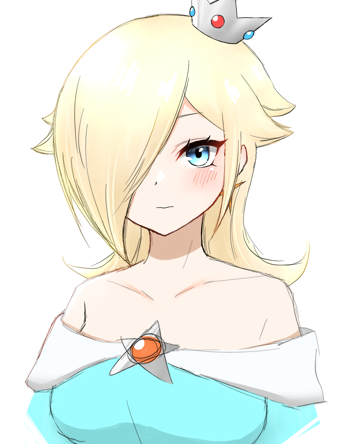 1girl aqua_eyes bare_shoulders blonde_hair blue_dress blush brooch closed_mouth crown dress earrings hair_ornament highres jewelry long_hair looking_at_viewer mario_(series) nintendo off_shoulder rosalina solo super_mario_galaxy tomatomiya upper_body