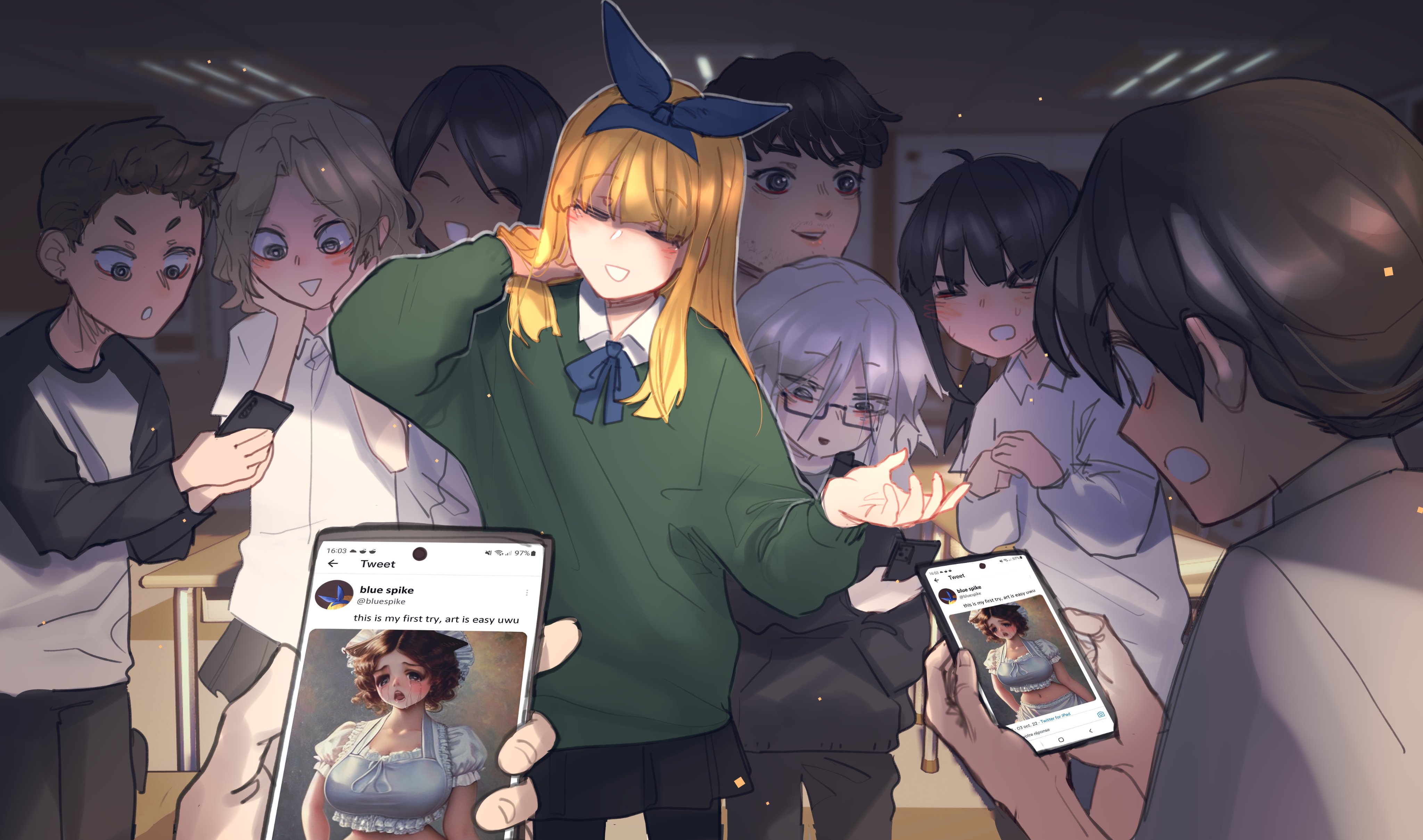 >_< 3boys 5girls =_= ^_^ absurdres adjusting_hair ai-assisted ai-generated_art_(topic) among_us_eyes_(meme) arm_up black-framed_eyewear black_eyes black_hair black_pants black_pantyhose black_skirt black_sleeves black_sweater blonde_hair blue_hairband blue_ribbon blunt_bangs blurry blurry_background blush cellphone classroom closed_eyes collared_shirt cowboy_shot dark-skinned_female dark_skin egg_(aiu404l) english_text erika_(popopoka) facial_hair fake_screenshot flat_chest glasses green_sweater grey_hair hair_bobbles hair_ornament hairband hand_in_pocket hand_up hands_on_own_cheeks hands_on_own_face hands_up happy head_tilt highres holding holding_phone indoors long_hair looking_at_phone looking_down matching_hair/eyes meme minecraft_youtube miniskirt multiple_boys multiple_girls mustache neck_ribbon open_mouth original own_hands_together pants pantyhose parted_bangs phone pleated_skirt popopoka pov raglan_sleeves ribbon semi-rimless_eyewear shirt short_hair sideways_mouth skirt smartphone smile solo_focus stubble sweater teeth twintails white_shirt wide-eyed