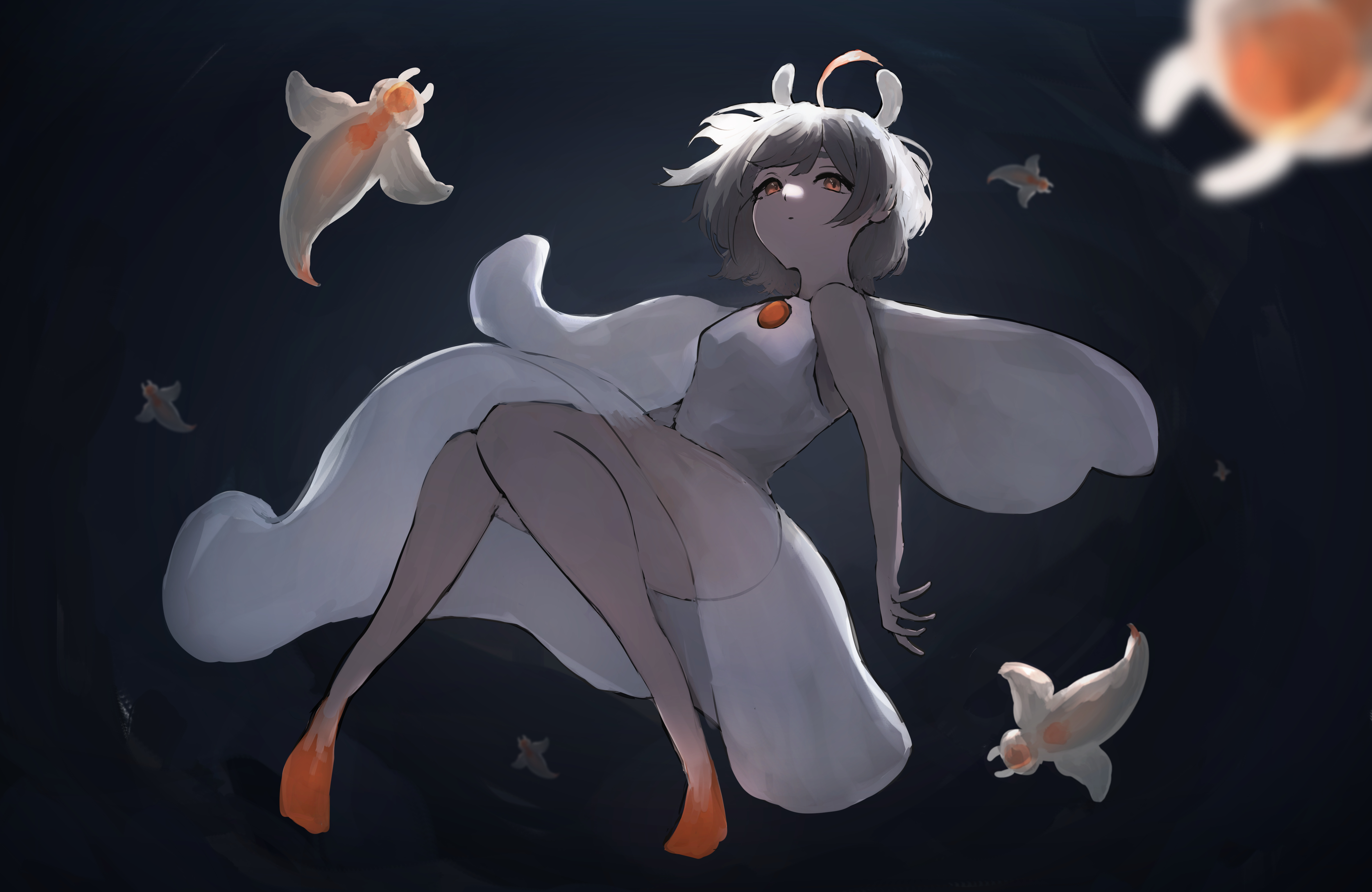 1girl absurdres closed_mouth dress expressionless full_body highres looking_up monster_girl ocean orange_eyes original personification pikuson sea_angel sleeveless submerged tentacle_hair see-through_body underwater white_dress white_hair wings