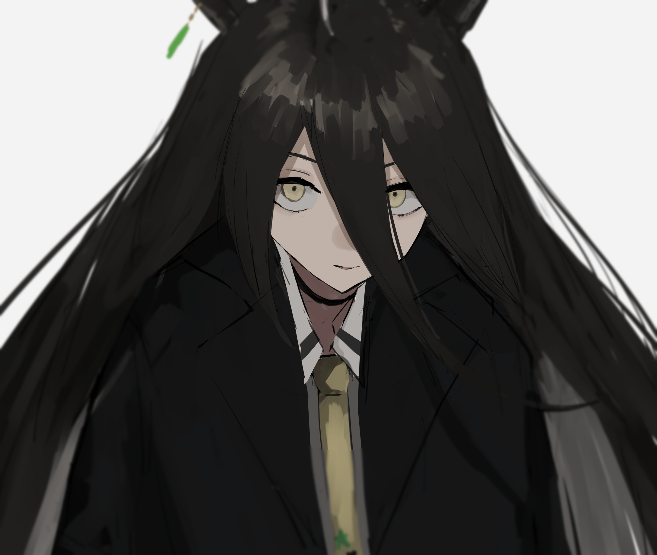 animal_ears black_hair closed_mouth collared_shirt earrings expressionless hair_between_eyes highres horse_ears horse_girl jacket jewelry long_hair looking_at_viewer manhattan_cafe_(umamusume) necktie open_clothes open_jacket pikuson portrait shirt simple_background single_earring solo umamusume upper_body white_background white_shirt yellow_eyes yellow_necktie