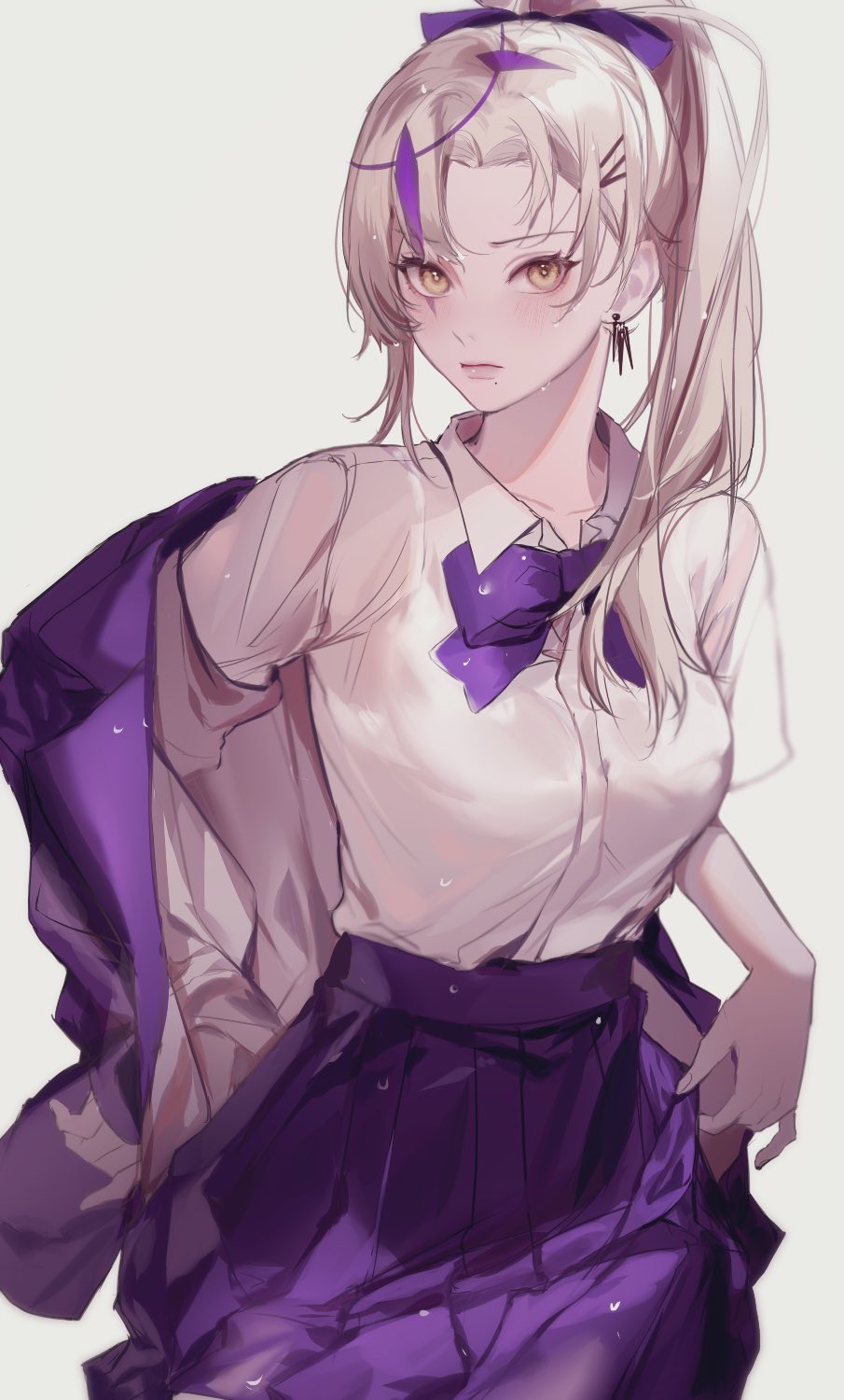 1girl alternate_costume asymmetrical_hair blonde_hair blush bow bowtie breasts closed_mouth collared_shirt commentary cowboy_shot dress_shirt earrings facepaint genderswap genderswap_(mtf) grey_background hair_ornament hair_ribbon hairclip highres holostars holostars_english jacket jewelry lips long_hair looking_at_viewer magni_dezmond medium_breasts miniskirt mole mole_under_eye off_shoulder open_clothes open_jacket parted_bangs pleated_skirt ponytail purple_bow purple_bowtie purple_jacket purple_ribbon purple_skirt ribbon shirt shirt_tucked_in simple_background skirt solo standing untranslatable_commentary to_e virtual_youtuber wet wet_clothes wet_hair white_shirt wing_collar yellow_eyes