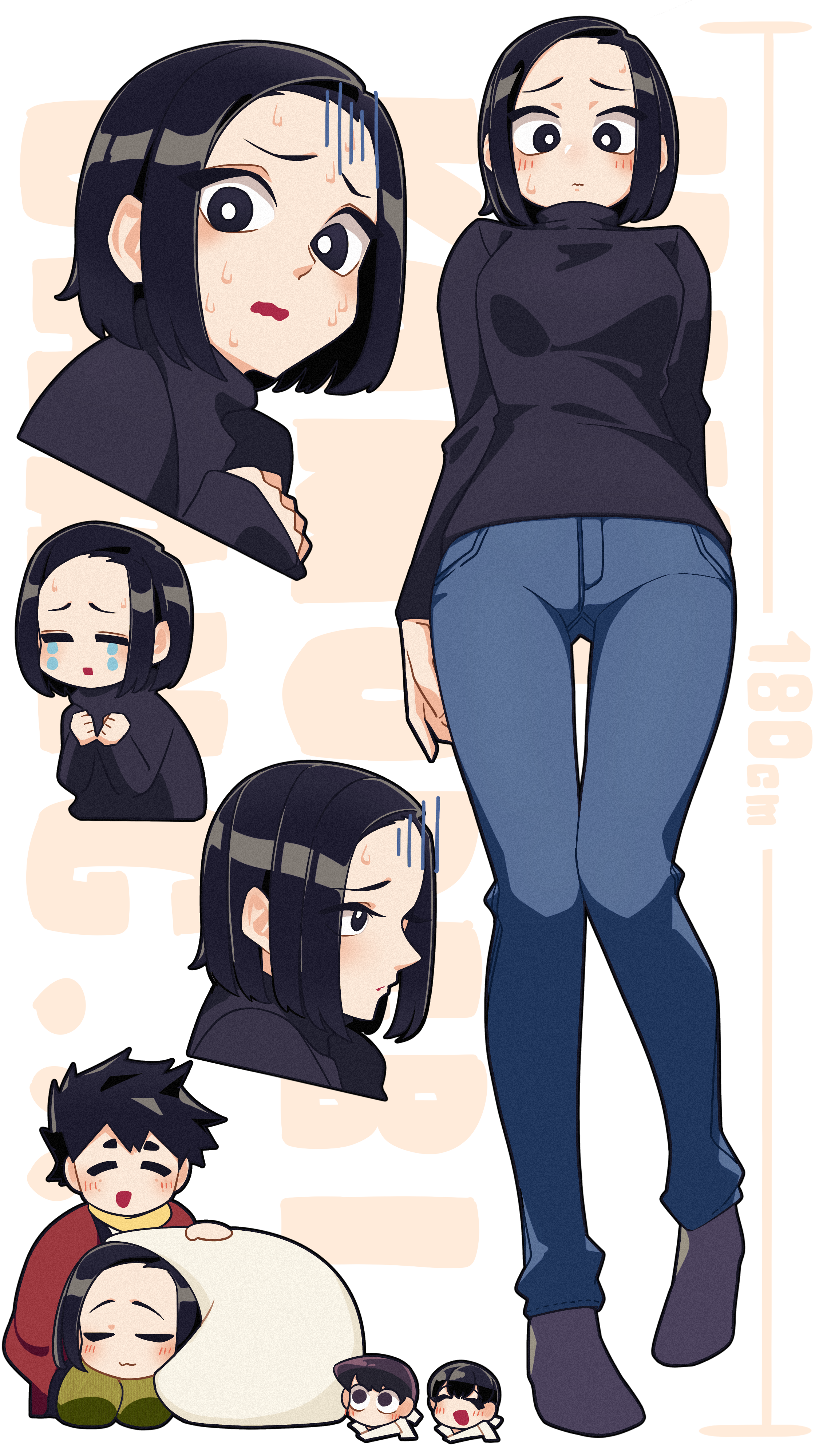 1other 3girls absurdres ambiguous_gender black_eyes black_shirt black_sweater character_request chibi chibi_inset covering_with_blanket denim highres hiki_komorebi inaka_nokoko jeans komi-san_wa_komyushou_desu komi_shouko lecca_aisu messy_hair multiple_girls multiple_views nervous pants shirt short_hair socks standing sweater turtleneck turtleneck_sweater