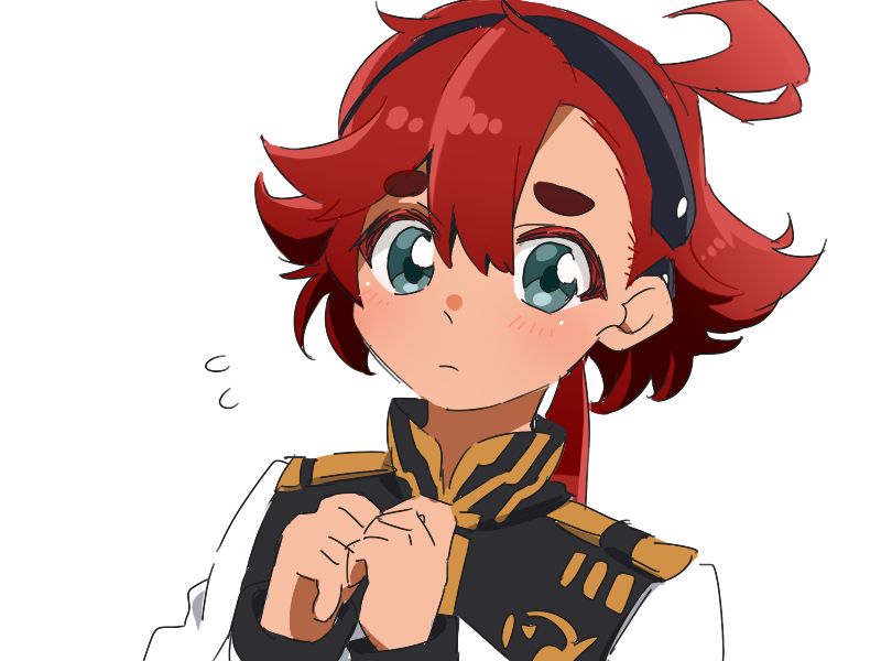 1girl ahoge amaiwashi black_hairband blue_eyes commentary_request gundam gundam_suisei_no_majo hairband long_hair looking_at_viewer low_ponytail partial_commentary ponytail red_hair simple_background solo suletta_mercury upper_body white_background