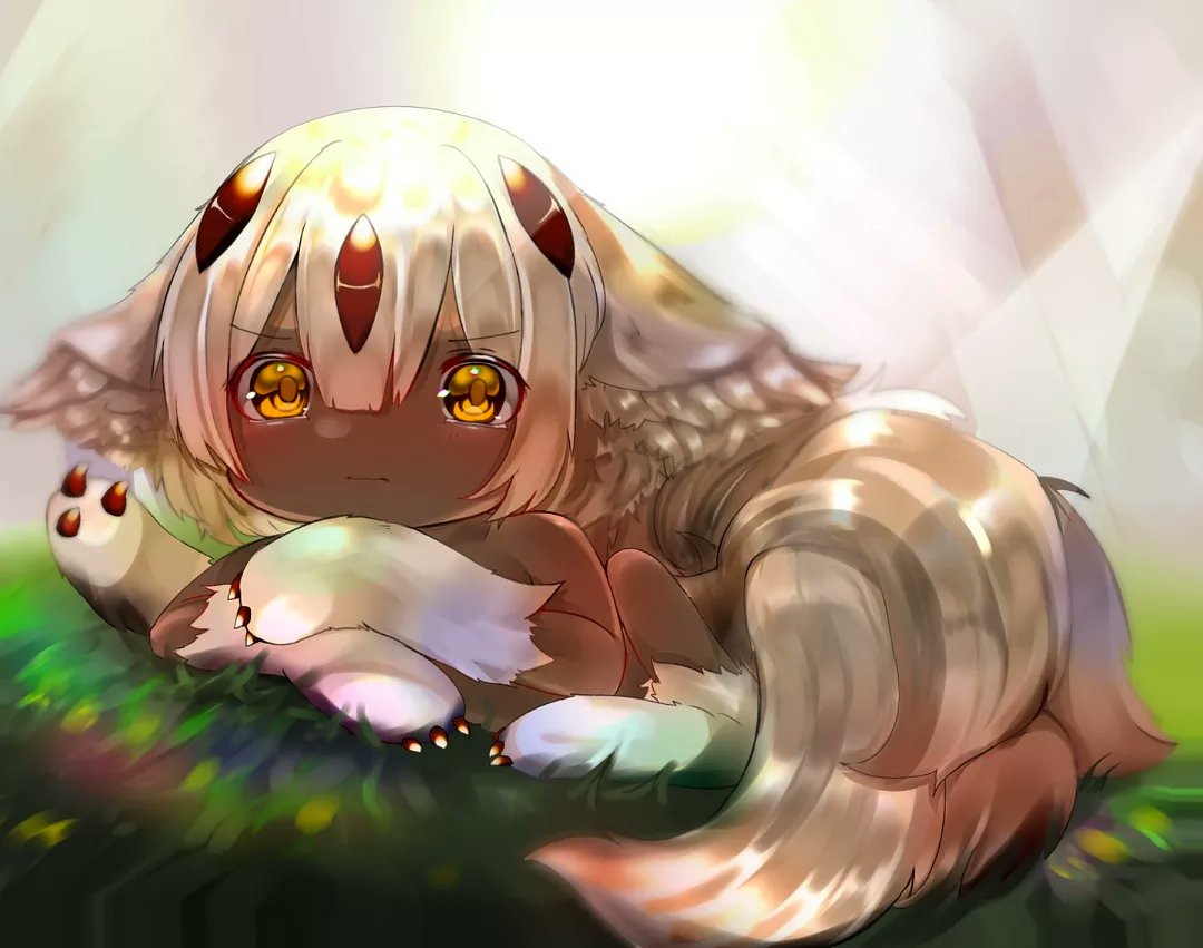 1girl black_skin claws colored_skin dark_skin extra_arms faputa female_focus grass kiadayon lying made_in_abyss monster_girl multiple_tails on_stomach pout solo tail very_dark_skin white_hair yellow_eyes