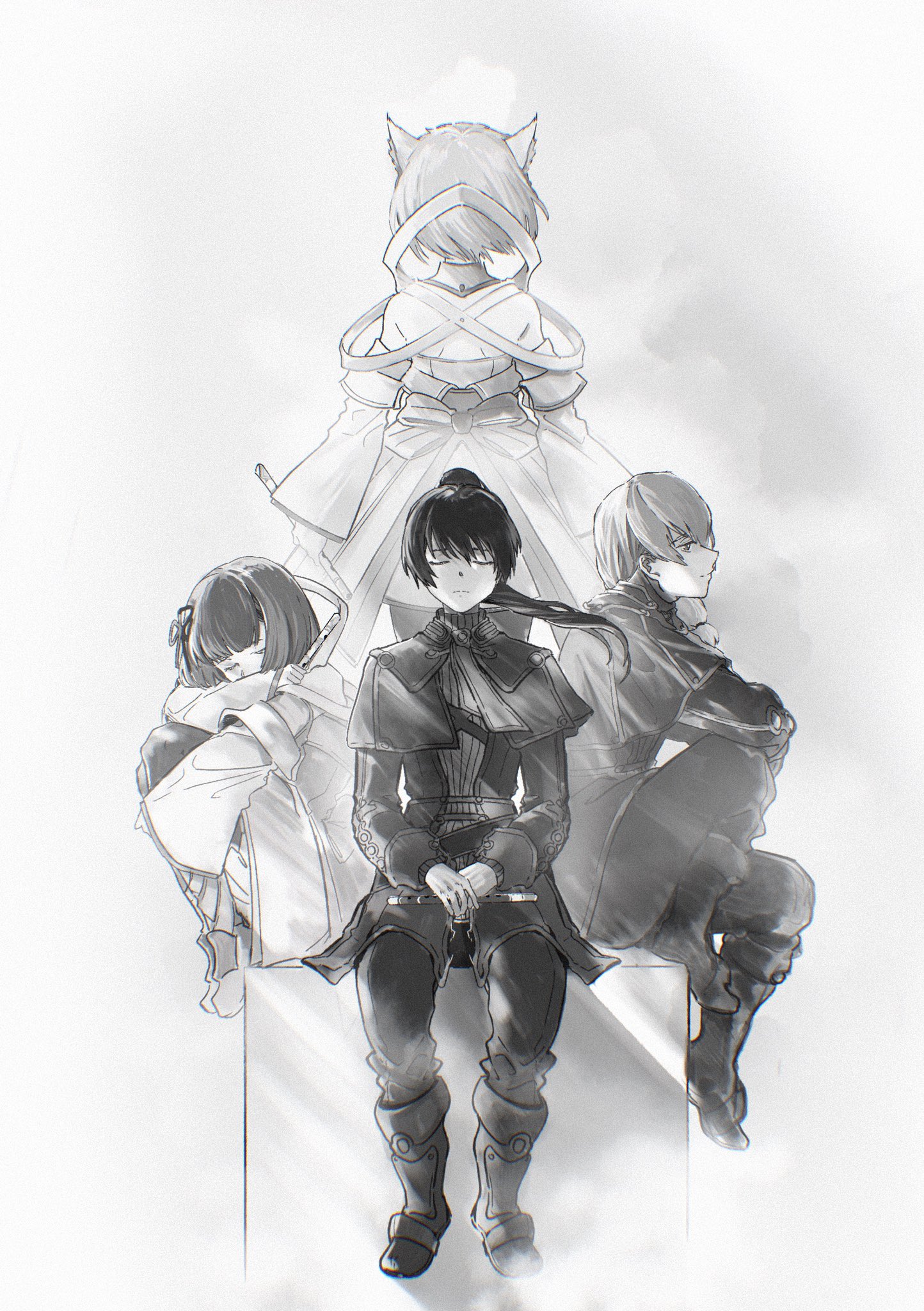 bare_shoulders crys_(xenoblade) flute greyscale highres instrument mio_(xenoblade) miyabi_(xenoblade) monochrome noah_(xenoblade) rourou_mirman xenoblade_chronicles_(series) xenoblade_chronicles_3