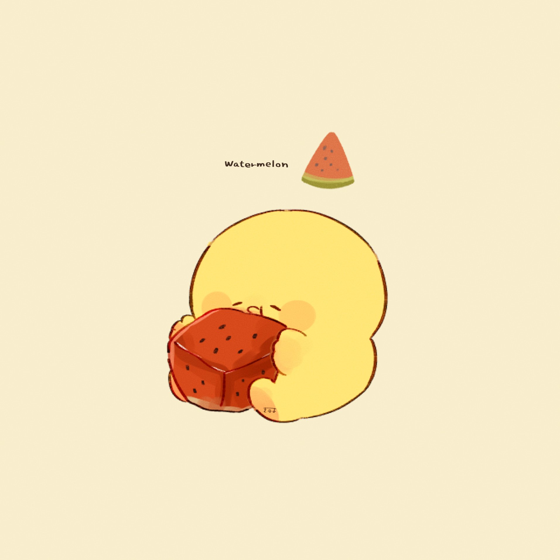 1other baby_animal bird blush_stickers chick commentary eating english_text food fruit highres holding holding_food holding_fruit holding_fruit kimipiyo_(tenmiyakiyo) no_humans original popsicle simple_background solo untranslatable_commentary tenmiyakiyo watermelon watermelon_slice yellow_background