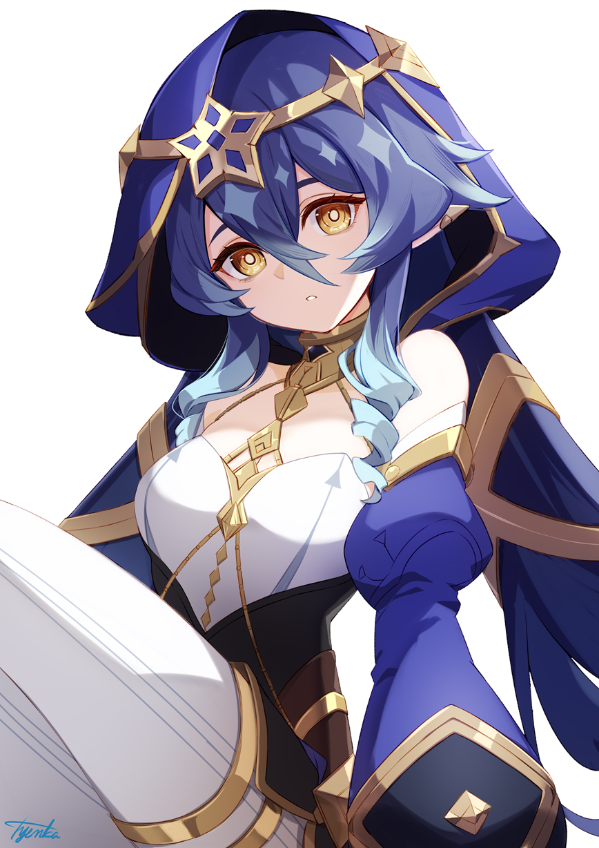 1girl bare_shoulders black_gloves blue_hair blue_hood bright_pupils claw_ring detached_sleeves drill_hair drill_sidelocks genshin_impact gloves hair_between_eyes highres hood jewelry juliet_sleeves layla_(genshin_impact) long_hair long_sleeves looking_at_viewer pointy_ears puffy_sleeves sidelocks solo tyenka7728 very_long_hair white_pupils yellow_eyes