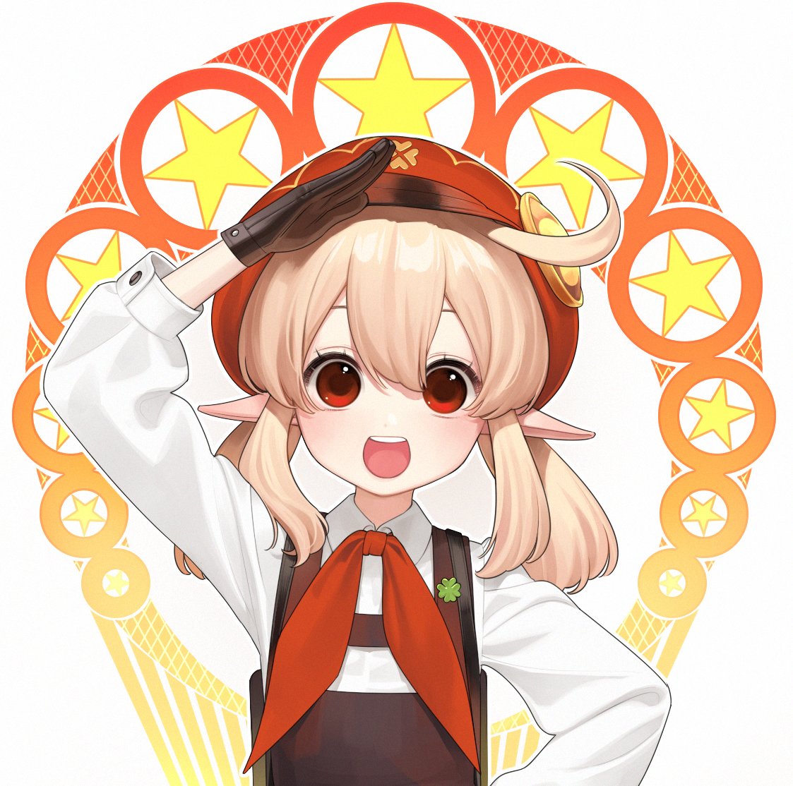 1girl abbystea alternate_costume blonde_hair brown_gloves newsboy_cap clover collared_shirt communism cowlick four-leaf_clover genshin_impact gloves hair_between_eyes hat klee_(genshin_impact) long_sleeves low_twintails medium_hair neckerchief overalls pioneer_neckerchief pointy_ears red_eyes red_hat red_neckerchief russian_commentary salute shirt sidelocks solo soviet_pioneer star_(symbol) twintails upper_body white_background white_shirt