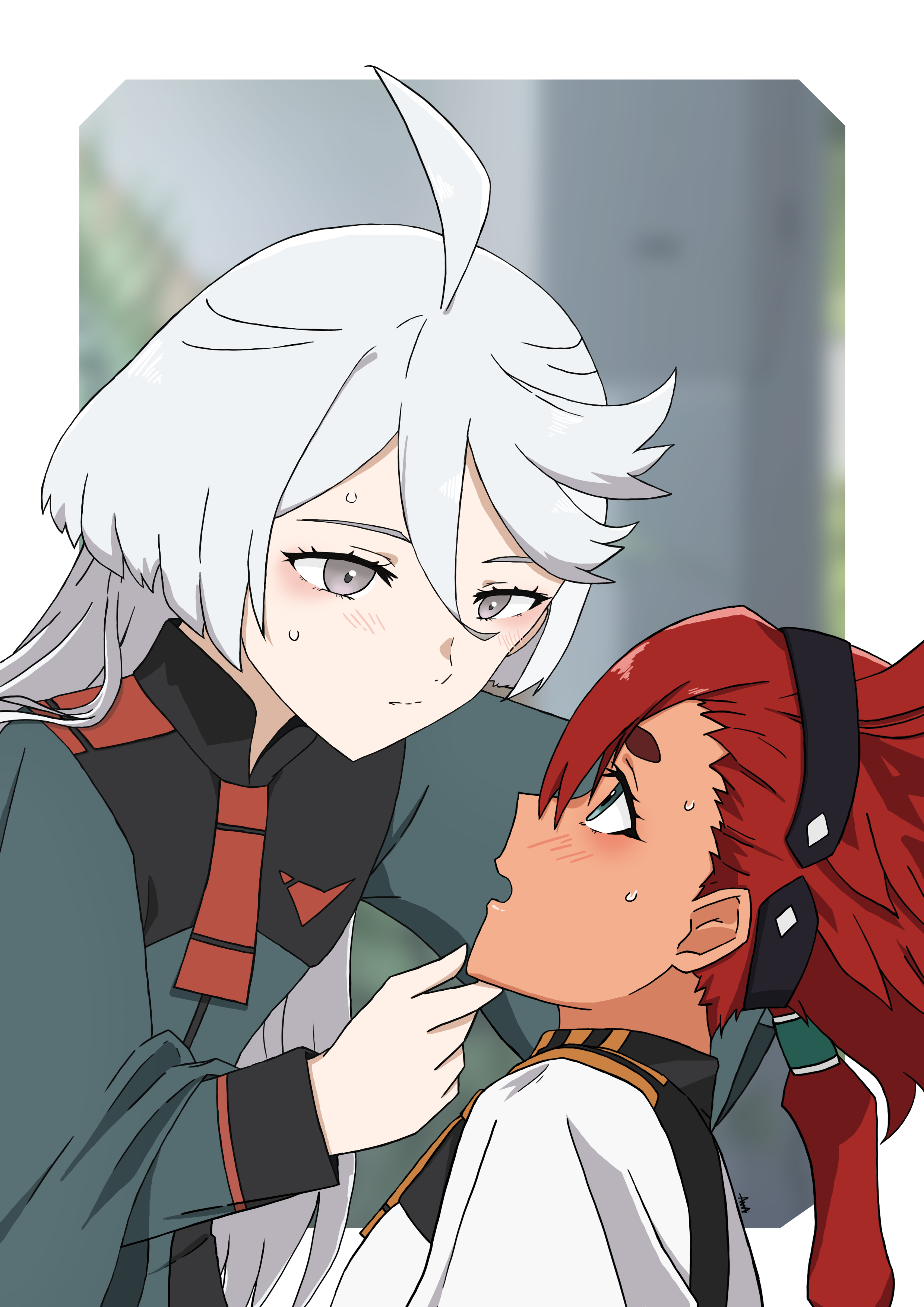 2girls absurdres ahoge aniani_ai blue_eyes blush embarrassed eye_contact grabbing_another's_chin grey_eyes gundam gundam_suisei_no_majo hairband hand_on_another's_chin highres looking_at_another military military_uniform miorine_rembran multiple_girls necktie open_mouth red_hair suletta_mercury sweat white_hair yuri