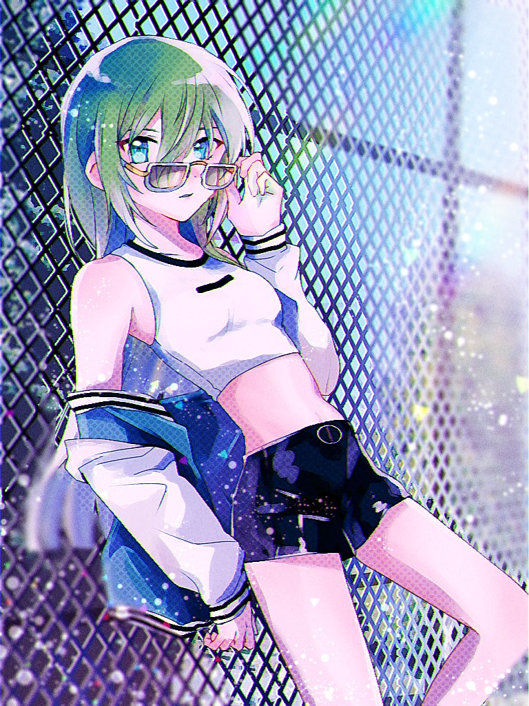 1girl adjusting_eyewear alina_gray aqua_eyes black_shorts blunt_ends breasts crop_top green_hair hair_between_eyes jacket long_hair magia_record:_mahou_shoujo_madoka_magica_gaiden mahou_shoujo_madoka_magica open_clothes open_jacket papisugureikai short_sleeves shorts sidelocks small_breasts solo straight_hair sunglasses very_long_hair