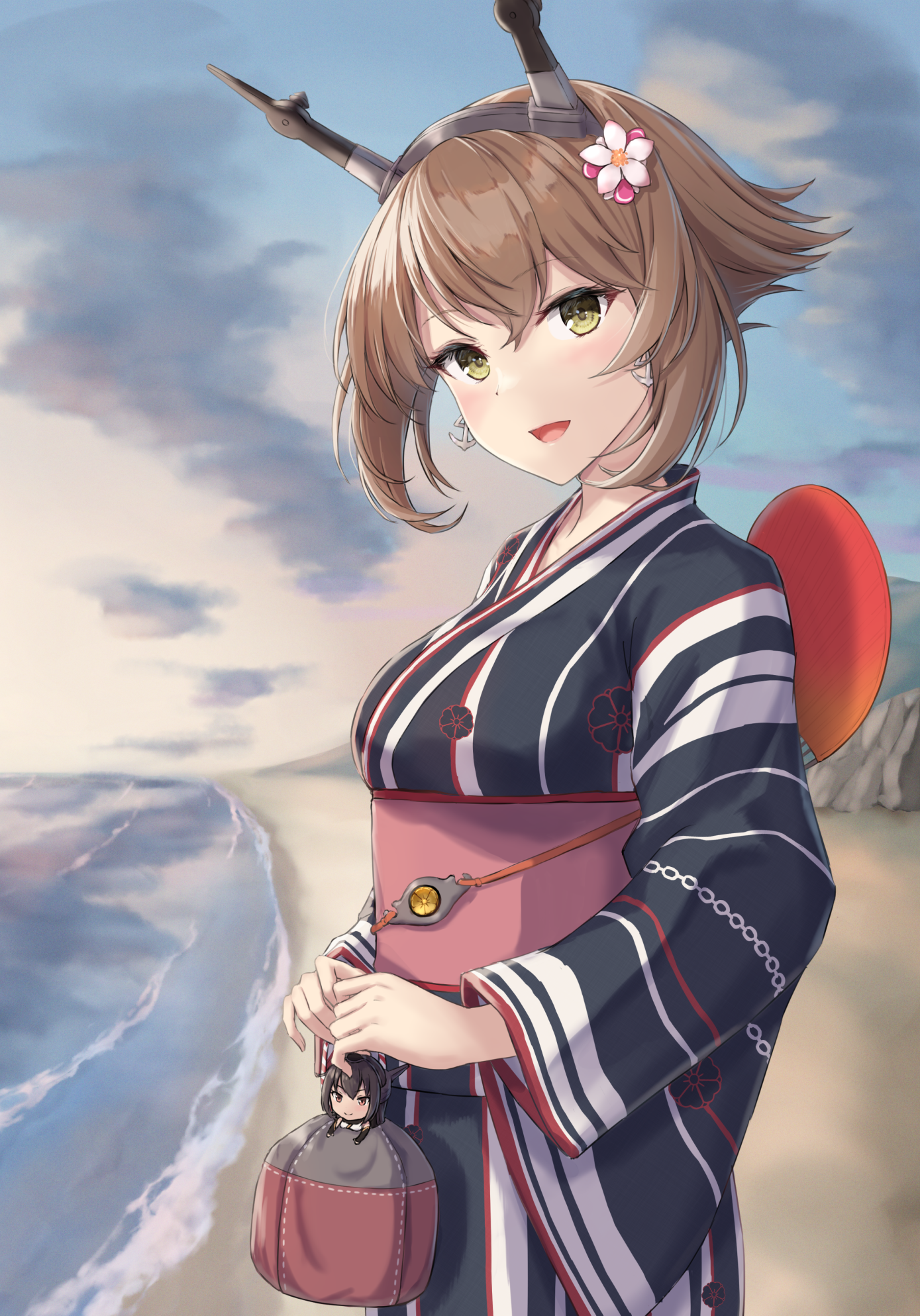 1girl beach black_kimono brown_hair character_doll commentary day doll flipped_hair flower green_eyes hair_flower hair_ornament hairband headgear highres japanese_clothes kantai_collection kimono monoku mutsu_(kancolle) nagato_(kancolle) obi official_alternate_costume outdoors radio_antenna sash short_hair solo striped_clothes striped_kimono