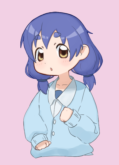 1girl blue_cardigan blue_hair brown_eyes cardigan clenched_hands drawfag furutani_kaede hair_tie open_mouth pink_background simple_background solo thick_eyebrows upper_body yuruyuri