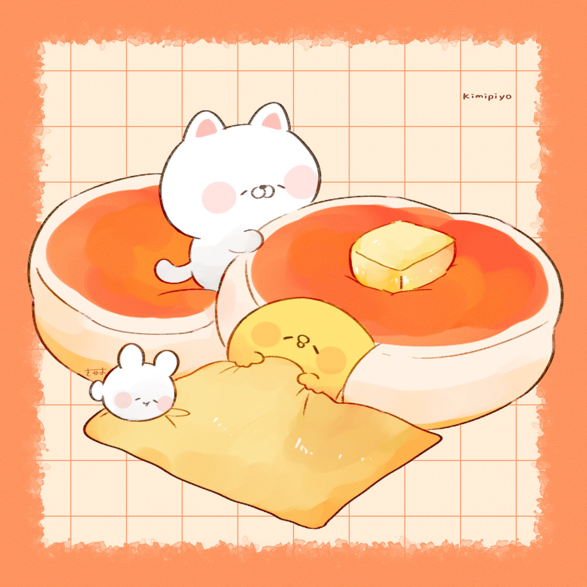 3others artist_name baby_animal bird blush_stickers border butter cat character_name chick chicken closed_eyes commentary creature english_text food highres kimipiyo_(tenmiyakiyo) multiple_others neko_(tenmiyakiyo) orange_border original oversized_food oversized_object pancake rabbit signature sleeping souffle_pancake untranslatable_commentary tenmiyakiyo usachii_(tenmiyakiyo)