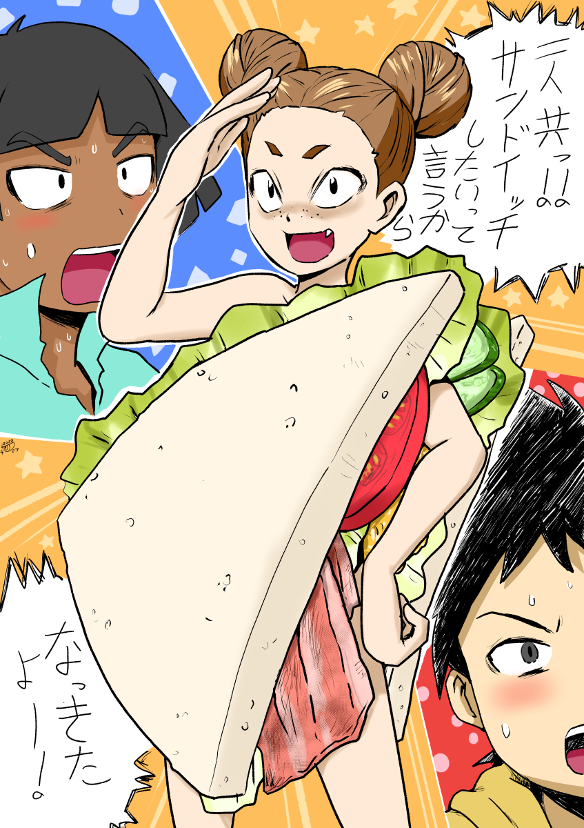 1girl 2boys child food food-themed_clothes gouguru highres kuroda_hayato matsuzaka_toru miura_akira multiple_boys sandwich shocked_pupils surprised translation_request youkai_watch youkai_watch_3