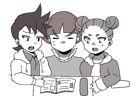 1girl 2boys child double_bun hair_bun kuroda_hayato matsuzaka_toru miura_akira monochrome multiple_boys youkai_watch youkai_watch_3