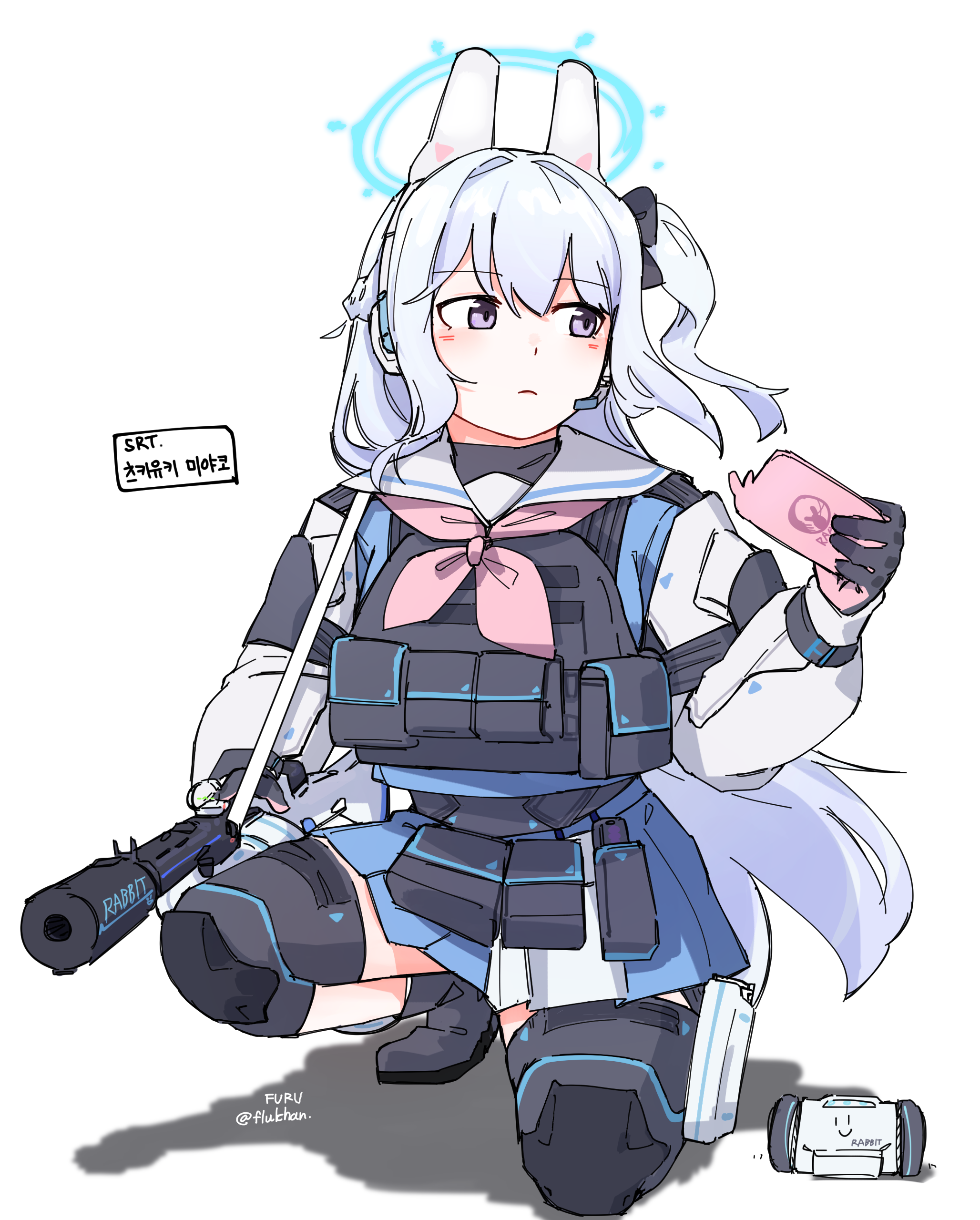 1girl absurdres black_bow black_gloves blue_archive blue_serafuku blue_shirt blue_skirt blush boots bow cellphone closed_mouth flukhan gloves grey_boots gun hair_between_eyes hair_bow halo headgear headset highres holding holding_phone jacket knee_pads long_hair long_sleeves looking_away looking_to_the_side miyako_(blue_archive) neckerchief on_one_knee one_side_up open_clothes open_jacket phone pink_neckerchief pleated_skirt puffy_long_sleeves puffy_sleeves purple_eyes sailor_collar school_uniform serafuku shadow shirt simple_background skirt solo submachine_gun suomi_kp/-31 twitter_username very_long_hair weapon white_background white_hair white_jacket white_sailor_collar