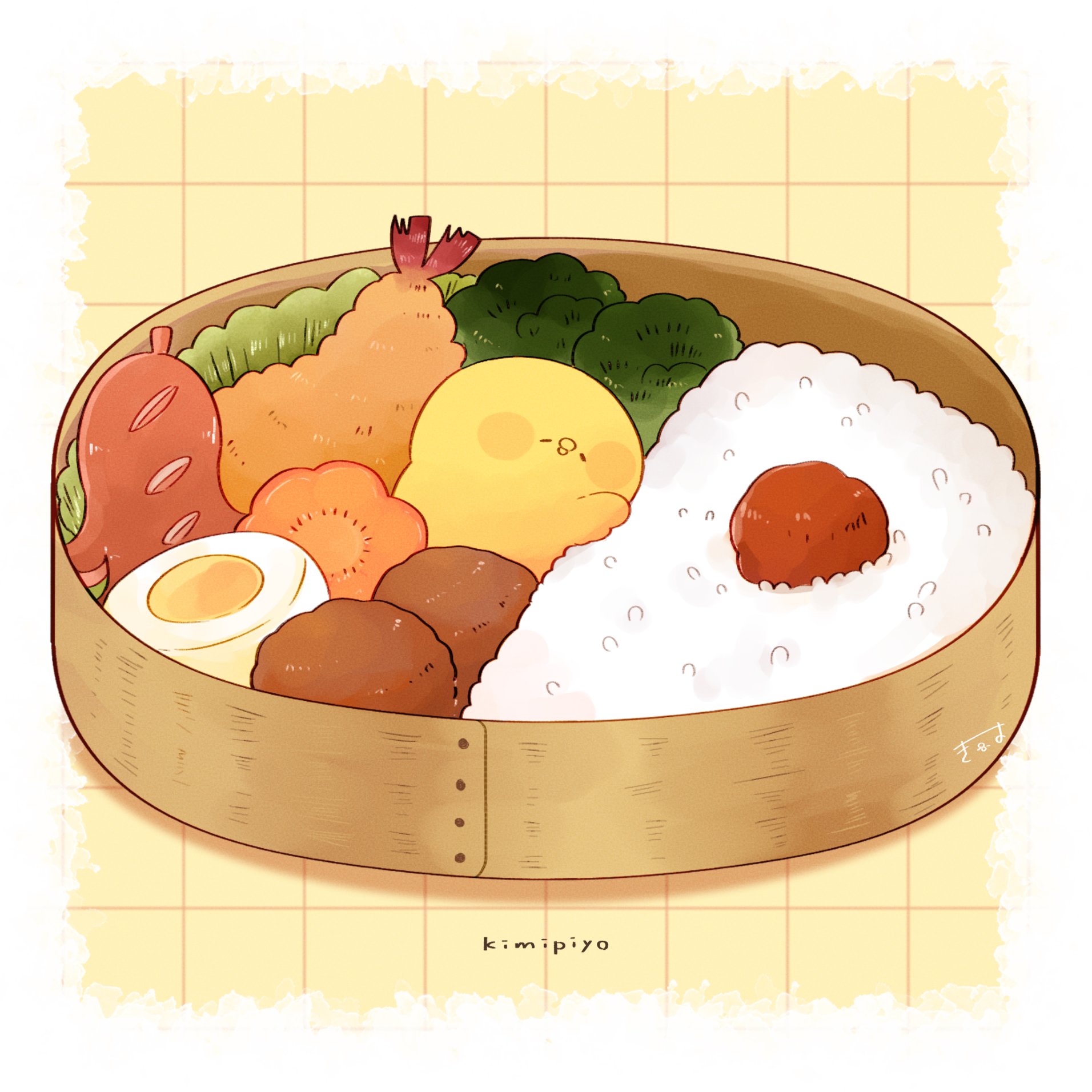 1other artist_name baby_animal bento bird border broccoli carrot_slice character_name chick chicken closed_eyes commentary egg_(food) english_text food food_art food_focus hardboiled_egg highres in_food kimipiyo_(tenmiyakiyo) meatball original oversized_food oversized_object rice romaji_text shrimp shrimp_tempura signature solo untranslatable_commentary tako-san_wiener tempura tenmiyakiyo white_border