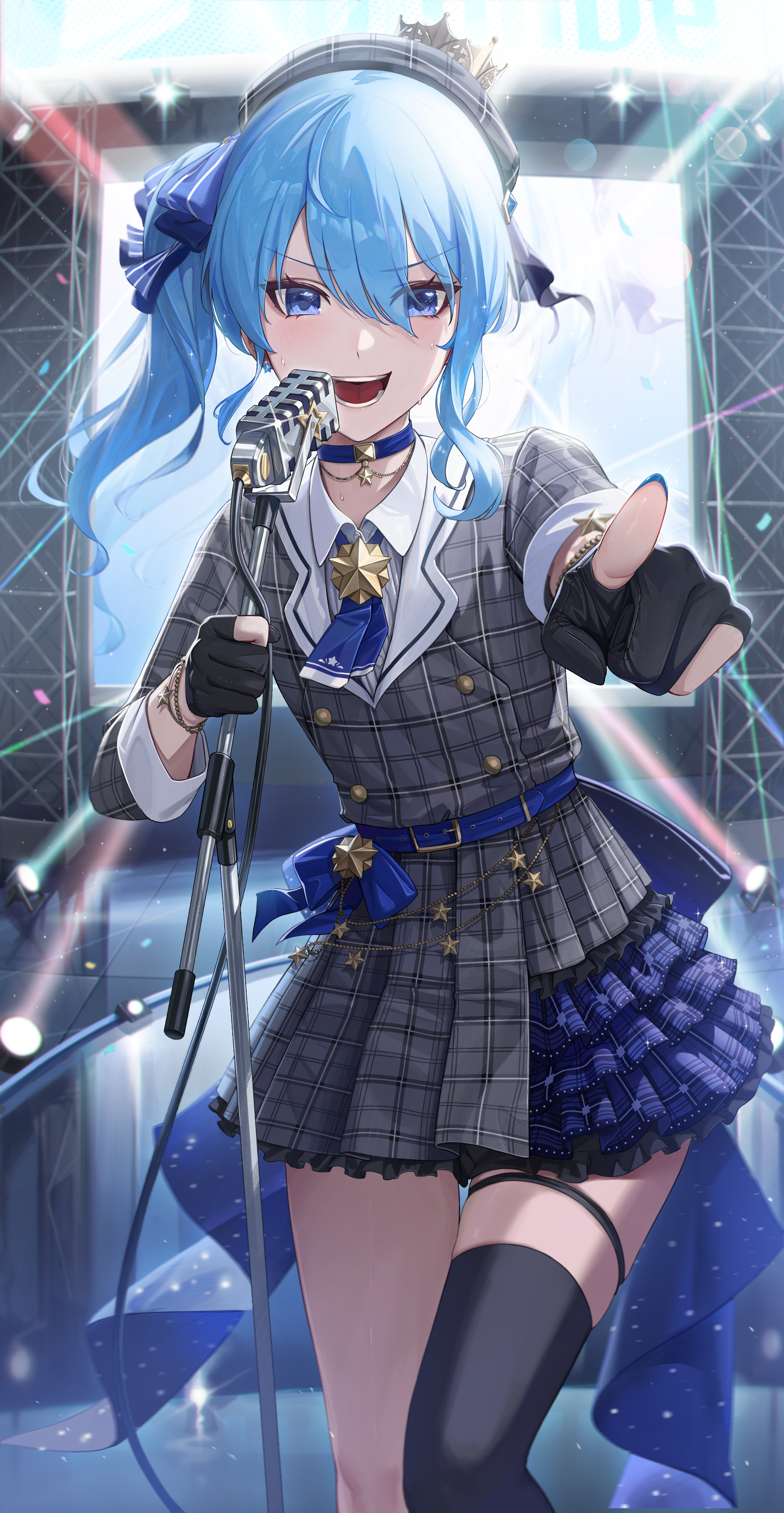 1girl absurdres ascot beret black_gloves blue_ascot blue_choker blue_eyes blue_hair blue_nails blue_ribbon bracelet buttons choker collared_shirt cryturtle double-breasted dress earrings gloves grey_headwear grey_jacket grey_skirt hair_between_eyes hair_ribbon hat highres holding holding_microphone hololive hoshimachi_suisei hoshimachi_suisei_(1st_costume) jacket jewelry long_sleeves medium_hair microphone miniskirt nail_polish one_side_up partially_fingerless_gloves plaid_clothes plaid_dress plaid_hat plaid_jacket plaid_skirt pointing pointing_forward ribbon shirt side_ponytail sidelocks single_thighhigh skirt star_(symbol) star_bracelet star_choker star_earrings thigh_strap thighhighs virtual_youtuber white_shirt