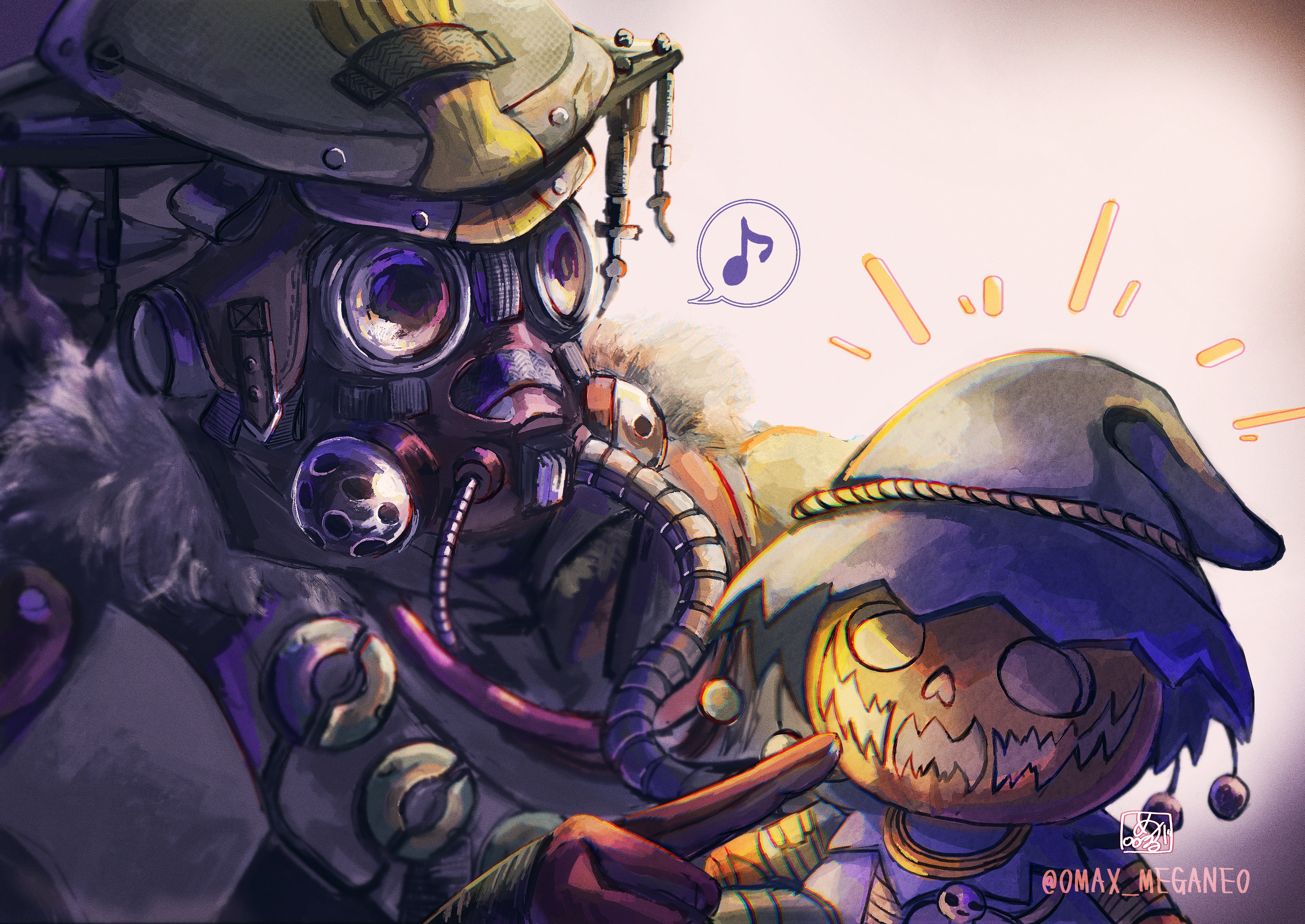 1other absurdres ambiguous_gender apex_legends bloodhound_(apex_legends) brown_jacket cable character_doll doll fur_trim gloves goggles helmet highres holding holding_doll jacket megane_(0max_megane0) musical_note poking protector_of_the_patch_bloodhound rebreather red_gloves solo speech_bubble spoken_musical_note twitter_username