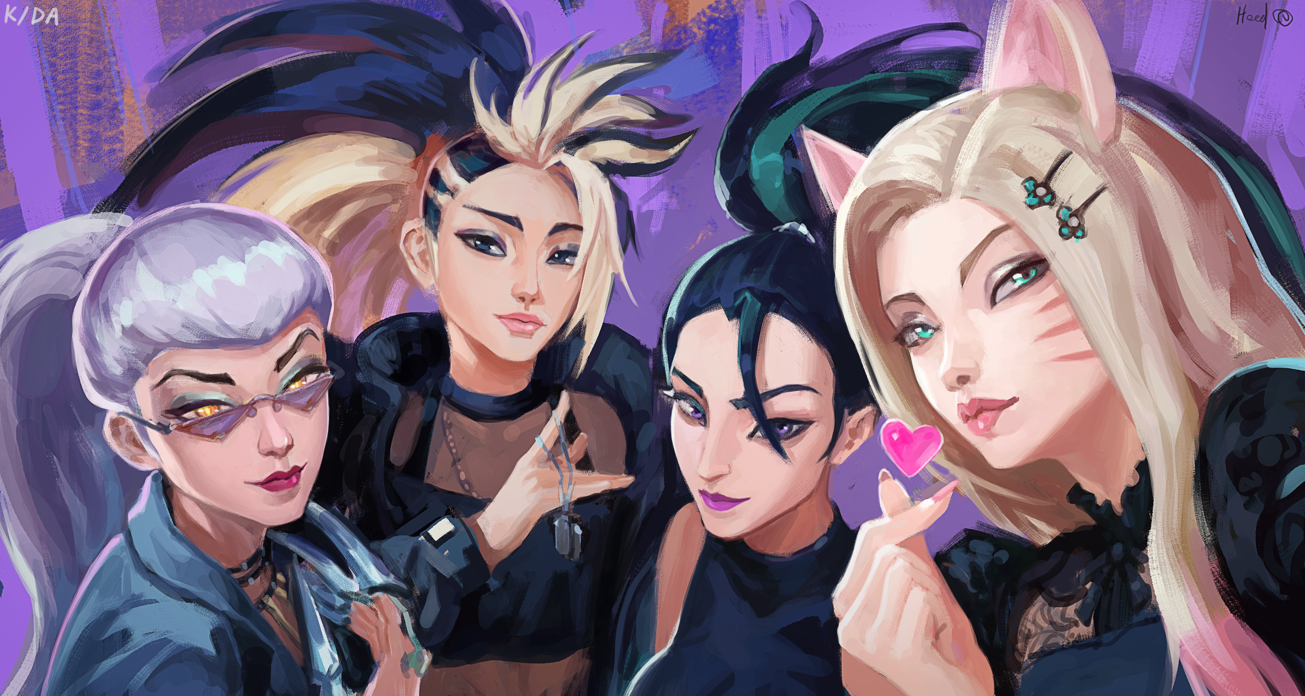 absurdres ahri_(league_of_legends) akali animal_ears aqua_eyes black_eyes black_hair blonde_hair claw_(weapon) dog_tags elvafirst evelynn_(league_of_legends) facial_mark fox_ears green_hair heart highres k/da_(league_of_legends) kai'sa league_of_legends multicolored_hair orange_eyes pink_lips ponytail purple_eyes purple_hair purple_lips red_lips signature smile sunglasses the_baddest_ahri the_baddest_akali the_baddest_evelynn the_baddest_kai'sa two-tone_hair weapon whisker_markings