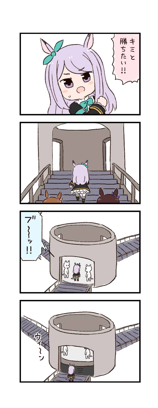 3girls 4koma :o animal_ears batta_(ijigen_debris) bow brown_hair comic ear_ribbon elevator extra highres horse_ears horse_girl long_hair looking_at_viewer mejiro_mcqueen_(umamusume) multiple_girls purple_eyes purple_hair solo_focus swept_bangs translated umamusume