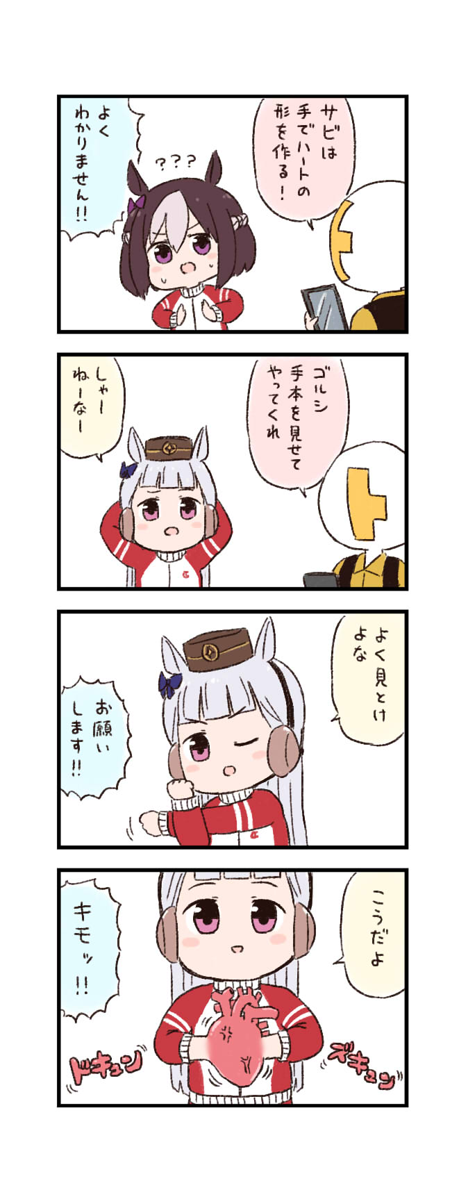 1boy 2girls 4koma animal_ears batta_(ijigen_debris) brown_hair chibi comic gold_ship_(umamusume) hat heart heart_(organ) heart_hands highres horse_ears horse_girl jacket long_hair medium_hair multiple_girls one_eye_closed purple_eyes special_week_(umamusume) stretching t-head_trainer_(umamusume) too_literal track_jacket trainer_(umamusume) translated umamusume