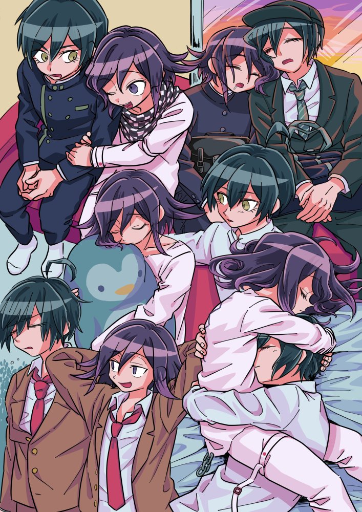 2boys 2gyks :o ahoge bag black_bag black_hair black_jacket black_pants black_scarf brown_jacket buttons checkered_clothes checkered_scarf closed_eyes danganronpa_(series) danganronpa_v3:_killing_harmony double-breasted drooling from_above hair_between_eyes head_hug holding holding_stuffed_toy hug hugging_doll hugging_object jacket long_sleeves looking_at_another lying multicolored_hair multiple_boys multiple_views necktie oma_kokichi on_side one_eye_closed open_mouth pants purple_hair red_necktie saihara_shuichi scarf shirt sleeping striped_clothes striped_necktie stuffed_animal stuffed_penguin stuffed_toy two-tone_hair white_jacket white_pants white_scarf white_shirt yaoi