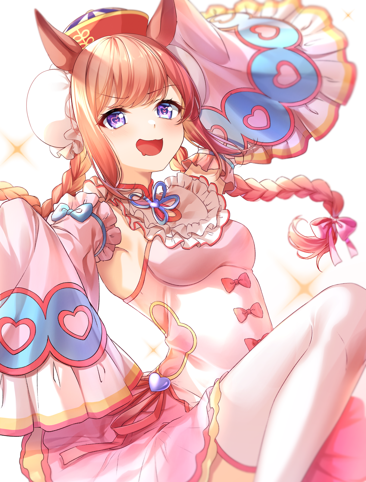 1girl :d agnes_digital_(lovely_jiangshi)_(umamusume) agnes_digital_(umamusume) animal_ears blue_eyes braid breasts brown_hair detached_sleeves dress drooling feet_out_of_frame hat heart heart-shaped_pupils highres horse_ears long_hair long_sleeves low_twintails medium_breasts mouth_drool open_mouth pink_dress pink_sleeves purple_eyes qingdai_guanmao rukinya_(nyanko_mogumogu) sleeveless sleeveless_dress sleeves_past_fingers sleeves_past_wrists small_breasts smile symbol-shaped_pupils thighhighs twin_braids twintails umamusume v-shaped_eyebrows very_long_hair white_background white_thighhighs wide_sleeves