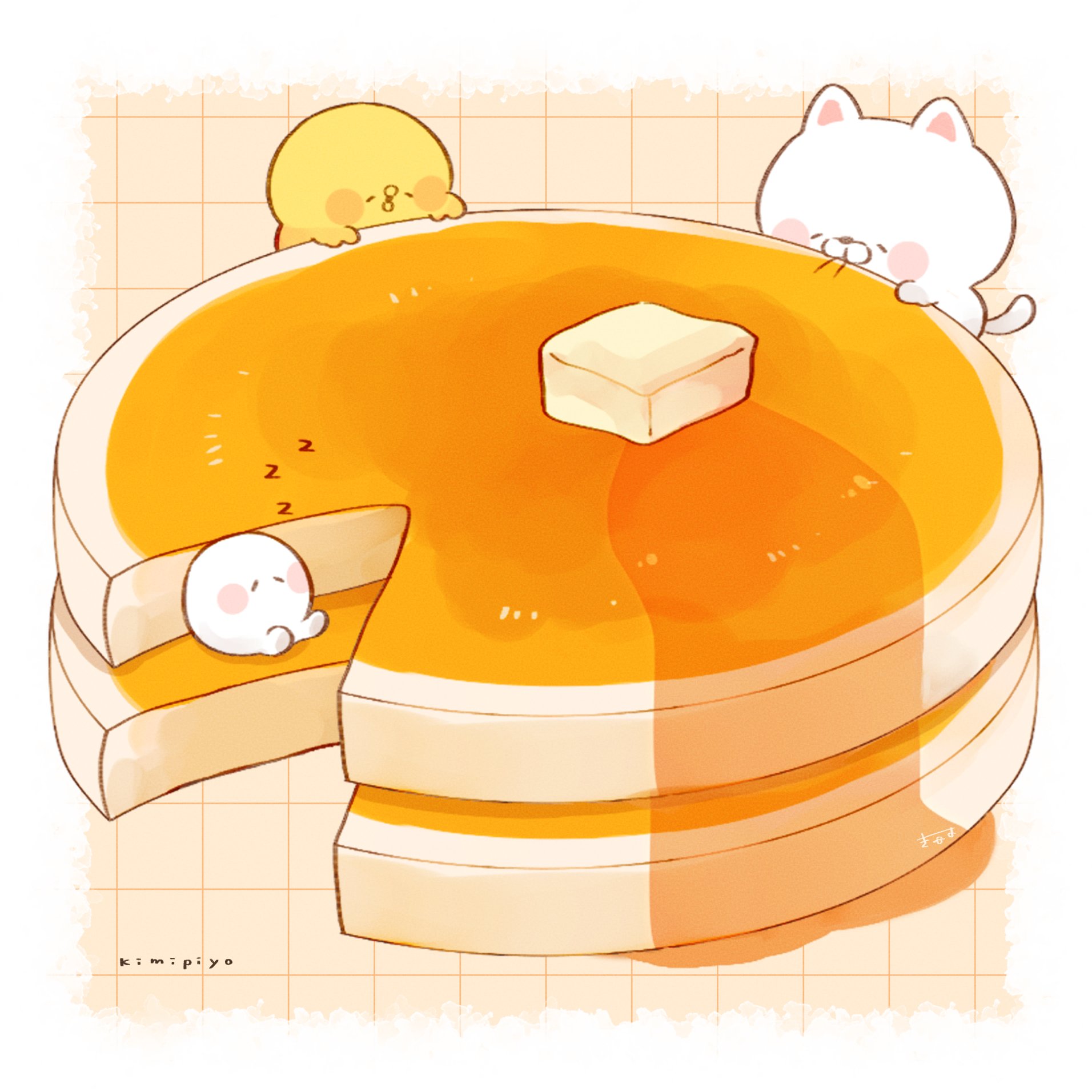 3others baby_animal bird blush_stickers border butter cat character_name chick commentary creature english_text food food_focus highres kimipiyo_(tenmiyakiyo) lying multiple_others neko_(tenmiyakiyo) on_back on_food original oversized_food oversized_object pancake pancake_stack sleeping souffle_pancake untranslatable_commentary syrup tenmiyakiyo tsubumaru_(tenmiyakiyo) white_border white_cat yellow_background zzz