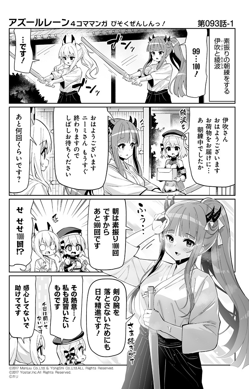 3girls 4koma :d ^^^ arm_up armband ayanami_(azur_lane) azur_lane beret blush bokken bow box breasts cardboard_box comic commentary_request copyright_notice cross detached_sleeves dress emphasis_lines gloves greyscale hair_between_eyes hair_bow hakama hat headgear highres holding holding_box holding_sword holding_weapon hori_(hori_no_su) horns ibuki_(azur_lane) iron_cross japanese_clothes kimono long_hair long_sleeves medium_breasts monochrome multiple_girls multiple_horns notice_lines o_o official_art open_mouth ponytail profile sidelocks sleeveless sleeveless_dress smile speech_bubble striped_bow surprised sweat sword translation_request v-shaped_eyebrows very_long_hair weapon wide_sleeves wooden_sword z23_(azur_lane)