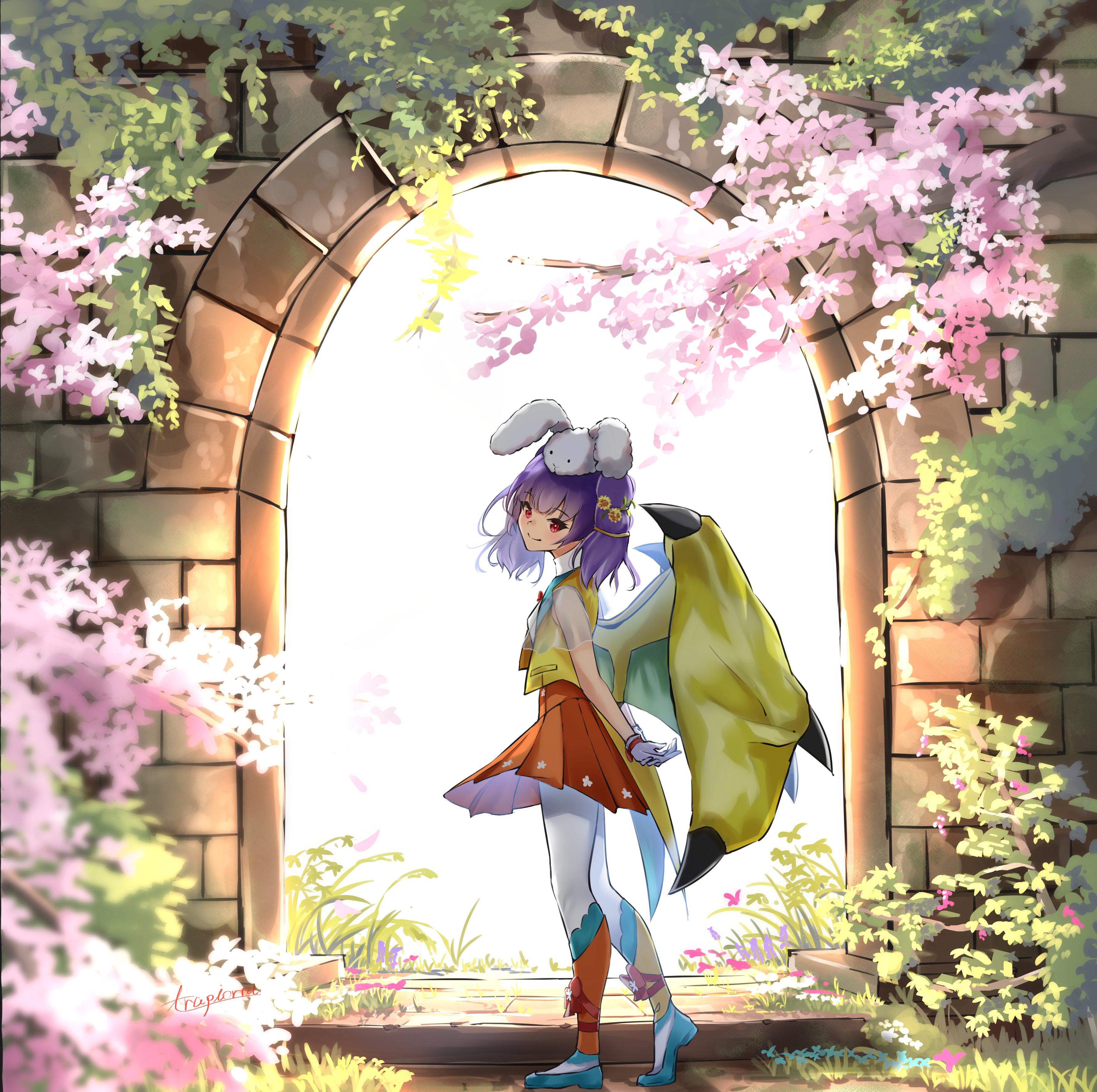 1girl absurdres animal_ears animal_hat ankle_lace-up arch arms_behind_back blue_footwear blue_legwear blunt_bangs bow bow_legwear capelet closed_mouth coattails collarbone cross-laced_clothes cross-laced_legwear dragon_girl dragon_wings dress fake_animal_ears fire_emblem fire_emblem:_the_sacred_stones fire_emblem_heroes flat_chest floral_print flower from_side full_body gloves grass green_wings hair_flower hair_ornament hair_tie hamanashi_(trapiorra) hat high-waist_skirt high_heels highres lapels light_smile long_hair looking_at_viewer looking_to_the_side magical_girl miniskirt multi-tied_hair multicolored_legwear myrrh_(fire_emblem) nintendo official_alternate_costume orange_bow orange_dress over_shoulder own_hands_together pale_skin pantyhose pink_flower plant purple_hair rabbit_ears rabbit_hat red_eyes ribbon see-through_clothes short_dress skirt sleeveless smile solo standing stone_wall sunflower sunlight tailcoat tree twintails vest walking wall white_gloves white_pantyhose wings yellow_vest yellow_wings