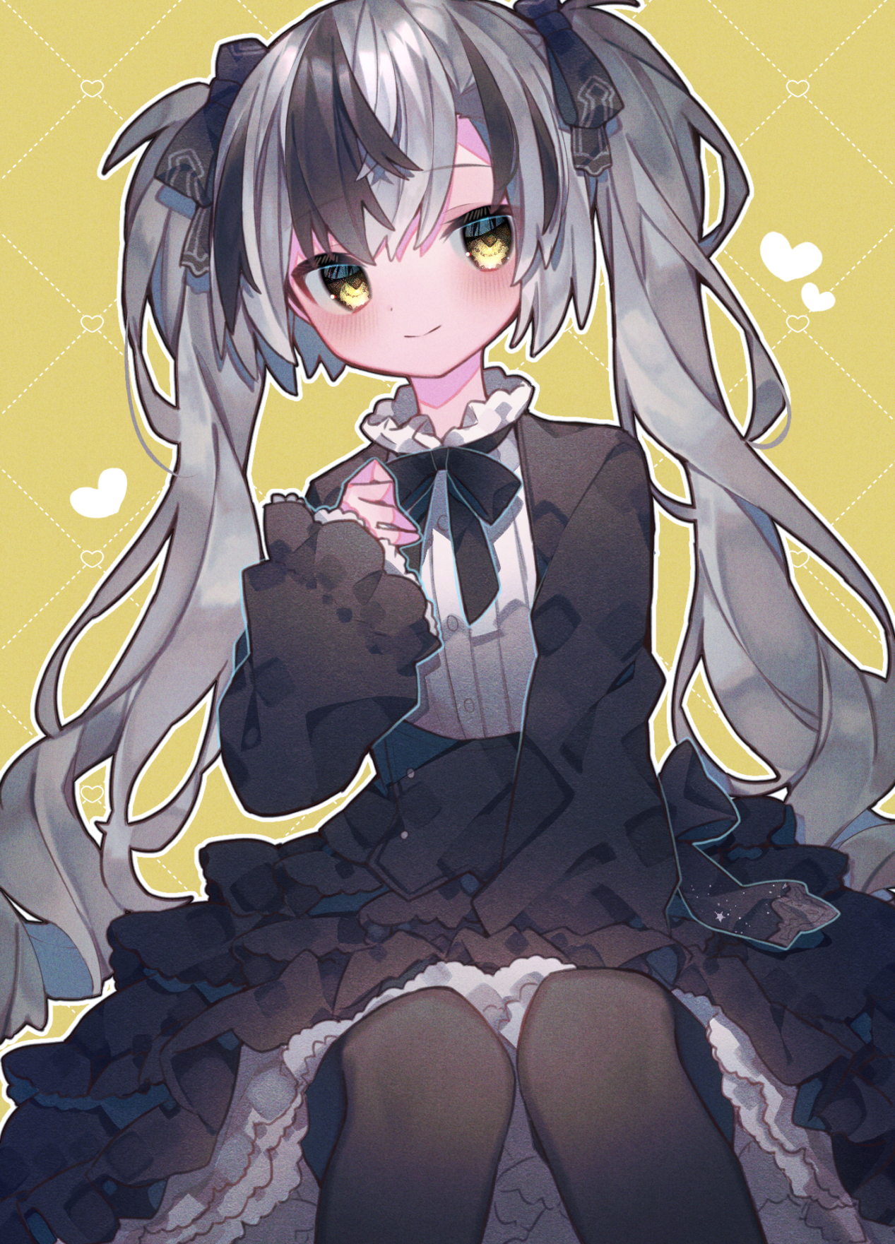 1boy black_hair blush dress eringikinono frilled_dress frills gothic_lolita grey_hair hair_ribbon high_collar highres lolita_fashion long_sleeves multicolored_hair neck_ribbon nijisanji pantyhose petticoat ribbon sitting smile solo streaked_hair suzuki_masaru suzuki_masaru_(ruko) trap two-tone_hair virtual_youtuber wide_sleeves yellow_eyes