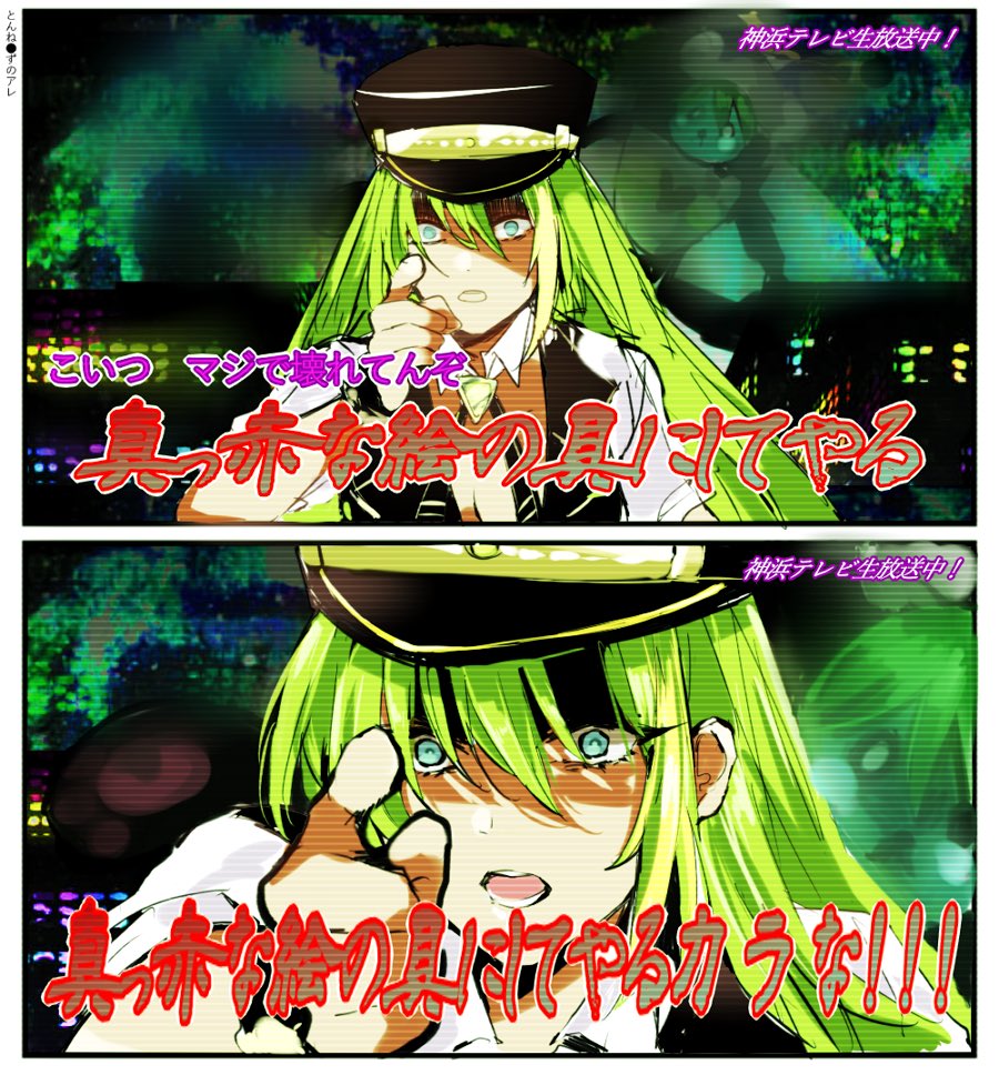 1girl alina_gray aqua_eyes black_hat black_necktie black_vest blunt_ends brooch collar cross_tie detached_collar doppel_(madoka_magica) fur_cuffs gem green_gem green_hair hair_between_eyes hat jewelry kyomukyomu_teyun lapels long_hair magia_record:_mahou_shoujo_madoka_magica_gaiden magical_girl mahou_shoujo_madoka_magica multicolored_hair necktie notched_lapels old_dorothy peaked_cap puffy_short_sleeves puffy_sleeves see-through_clothes see-through_sleeves short_sleeves sidelocks sleeve_cuffs solo straight_hair streaked_hair v-neck very_long_hair vest white_collar white_sleeves