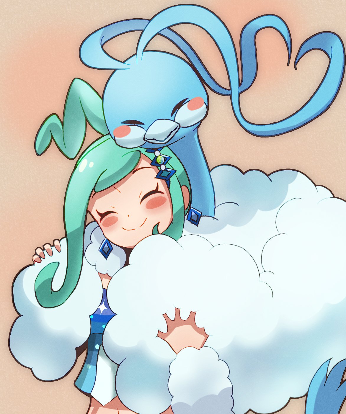 1girl affectionate altaria arm_warmers blue_shirt blush_stickers brown_background closed_eyes closed_mouth commentary_request earrings fluffy gen_3_pokemon green_hair hair_ornament highres jewelry lisia_(pokemon) long_hair nintendo pokemon pokemon_(creature) pokemon_omega_ruby_and_alpha_sapphire shirt shugara smile split_mouth