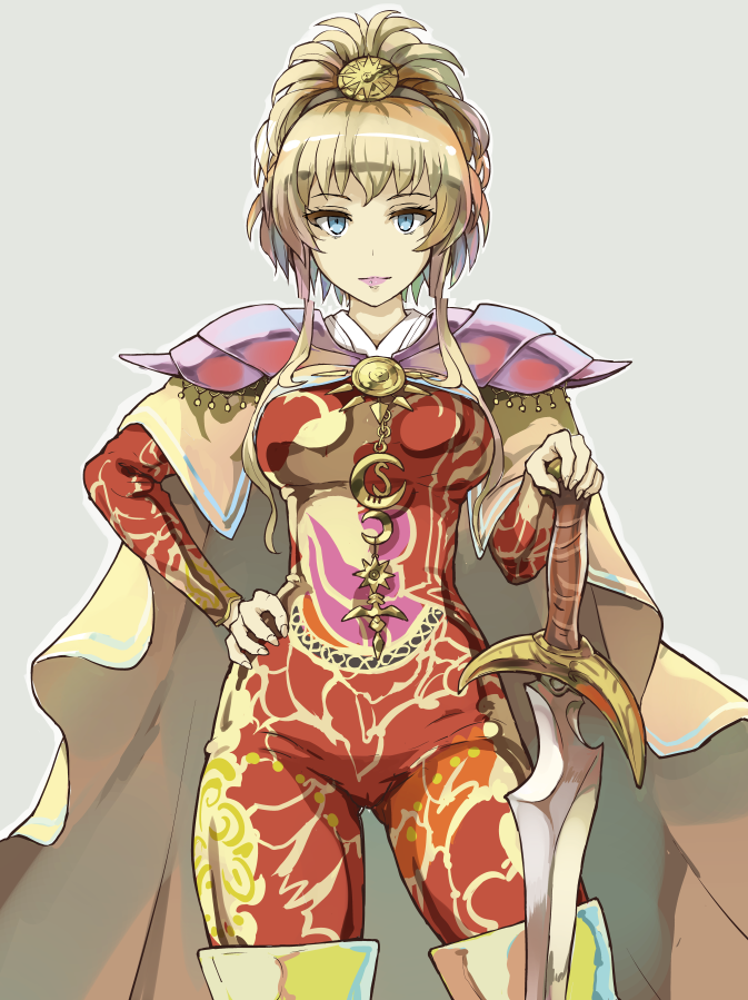 1girl blonde_hair bodysuit boots cape greatsword hand_on_own_hip high_ponytail holding holding_sword holding_weapon messy_hair ponytail protagonist_(romancing_saga_2) red_bodysuit romancing_saga_2 saga shoulder_pads simple_background skin_tight sword the_final_empress thigh_boots weapon yuugiri_(u-slash)