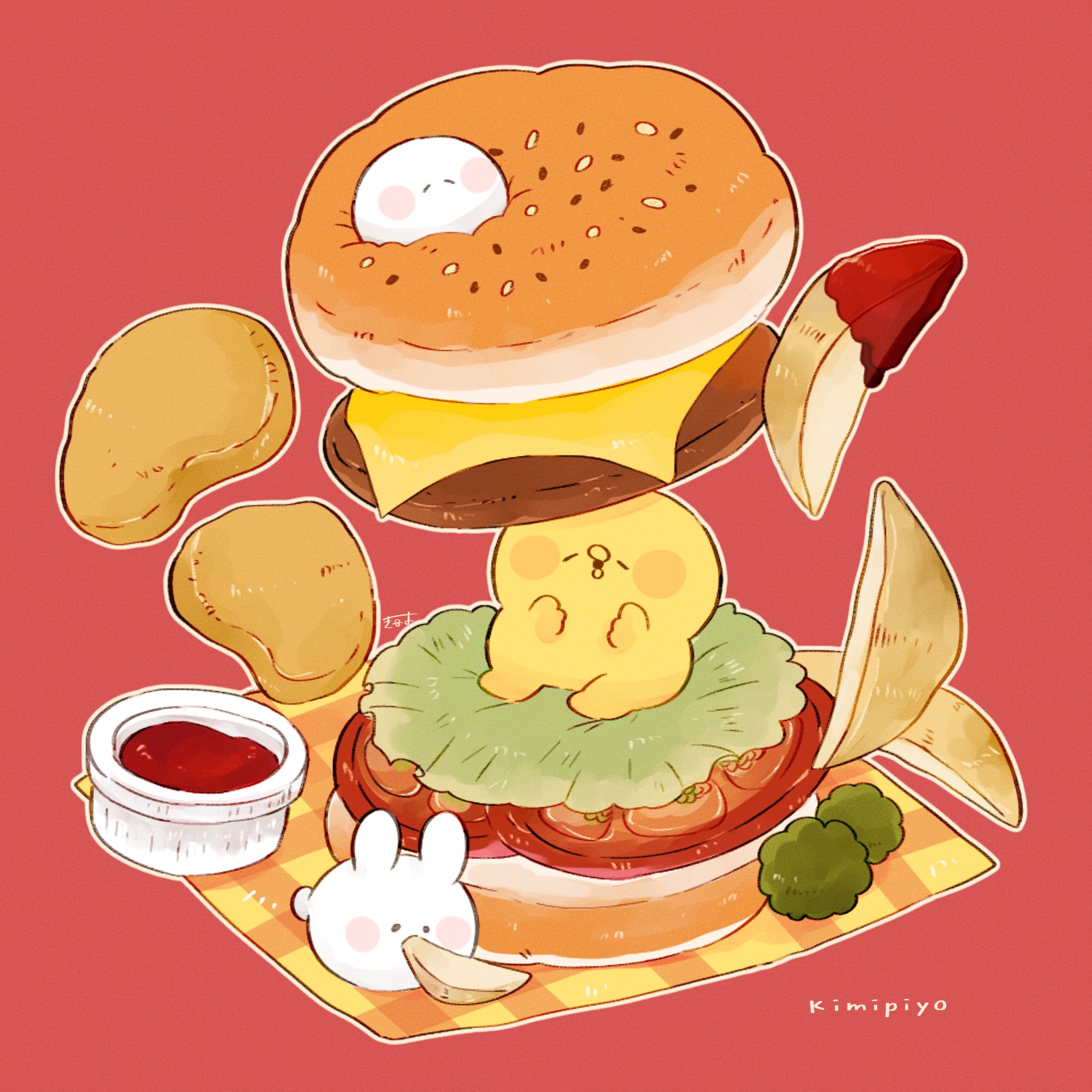 3others baby_animal bird blush_stickers burger character_name cheese chick chicken_nuggets creature english_text food food_focus highres ketchup kimipiyo_(tenmiyakiyo) lettuce multiple_others napkin on_food original oversized_food oversized_object plaid_tablecloth potato_wedges rabbit red_background sesame_seeds sitting tenmiyakiyo tsubumaru_(tenmiyakiyo) usachii_(tenmiyakiyo)