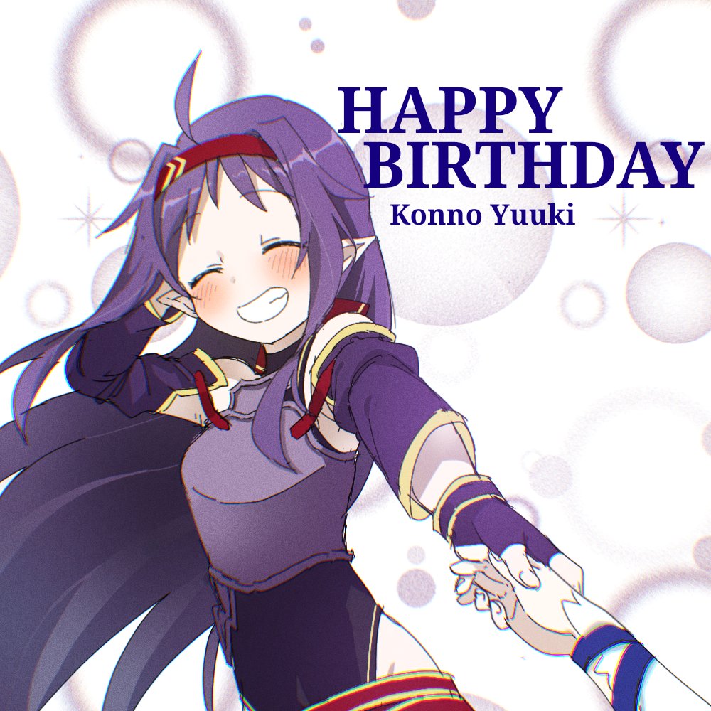 2girls ahoge armor asuna_(sao) asuna_(sao-alo) bare_shoulders blush breastplate character_name closed_eyes detached_sleeves english_text fingerless_gloves gloves hairband hand_on_own_head happy_birthday holding_hands long_hair multiple_girls out_of_frame pointy_ears purple_armor purple_gloves purple_hair red_hairband smile sword_art_online teeth upper_body wqn0930 yuuki_(sao)