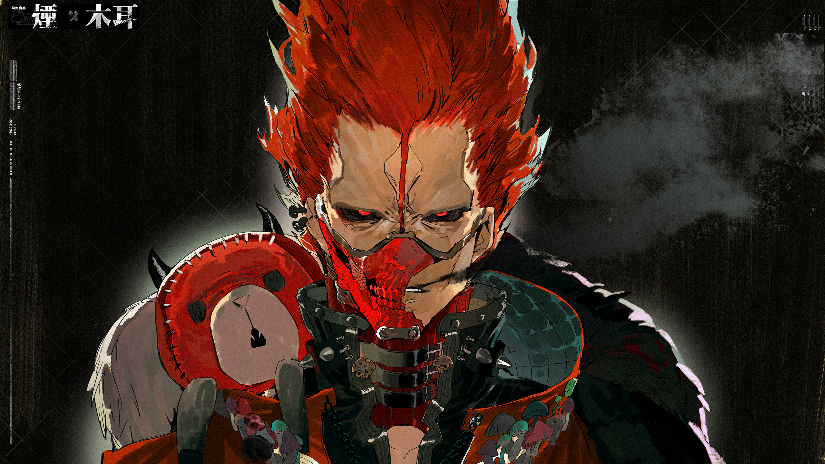 1boy angry animal animal_on_shoulder black_background black_sclera blowing_smoke broken_mask chain colored_sclera dorohedoro earrings en_(dorohedoro) fangs high_collar highres horns jewelry kikurage_(dorohedoro) looking_at_viewer mask multiple_earrings mushroom nano_(c175311) portrait red_eyes respirator scar scar_on_face single_earring smoke solo_focus spiked_hair widow's_peak