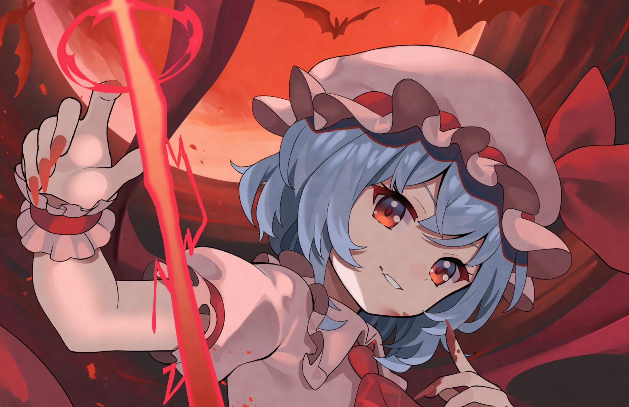 1girl arm_up ascot bad_id bad_twitter_id bat_(animal) bat_wings blood blood_on_face blood_on_hands blue_hair closed_mouth collared_dress commentary_request dress fang fingernails flying frills hair_between_eyes hands_up hat hat_ribbon highres long_fingernails looking_at_viewer mob_cap moon nail_polish night pink_dress pink_hat puffy_short_sleeves puffy_sleeves red_ascot red_eyes red_moon red_nails red_ribbon red_sky remilia_scarlet ribbon short_hair short_sleeves sky smile solo spear_the_gungnir teeth touhou upper_body v-shaped_eyebrows weapon wings wrist_cuffs yuujin_(yuzinn333)