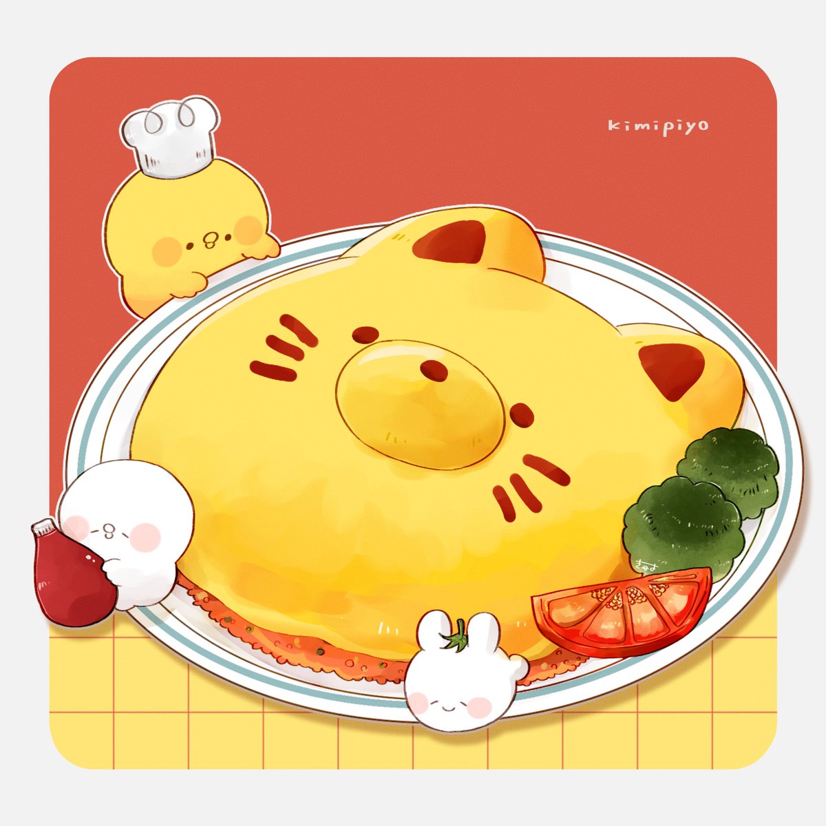 3others animal-themed_food artist_name baby_animal bird blush_stickers border broccoli cat character_name chef_hat chick chicken closed_eyes commentary creature egg_(food) english_text food food_art food_focus grey_border hat highres kimipiyo_(tenmiyakiyo) multiple_others no_humans omelet omurice original oversized_food oversized_object plate rabbit red_background shiropiyo_(tenmiyakiyo) signature simple_background smile solid_circle_eyes untranslatable_commentary tenmiyakiyo tomato tomato_slice usachii_(tenmiyakiyo)