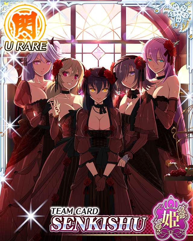 5girls black_hair blonde_hair breasts brown_hair candle choker cleavage dress flower gloves green_eyes grey_hair hair_flower hair_ornament hyoki_(senran_kagura) large_breasts long_hair maki_(senran_kagura) miki_(senran_kagura) multiple_girls official_art pink_eyes pink_hair purple_eyes red_eyes reki_(senran_kagura) ribbon senran_kagura senran_kagura_new_wave short_hair sunset window yellow_eyes yuki_(senran_kagura)